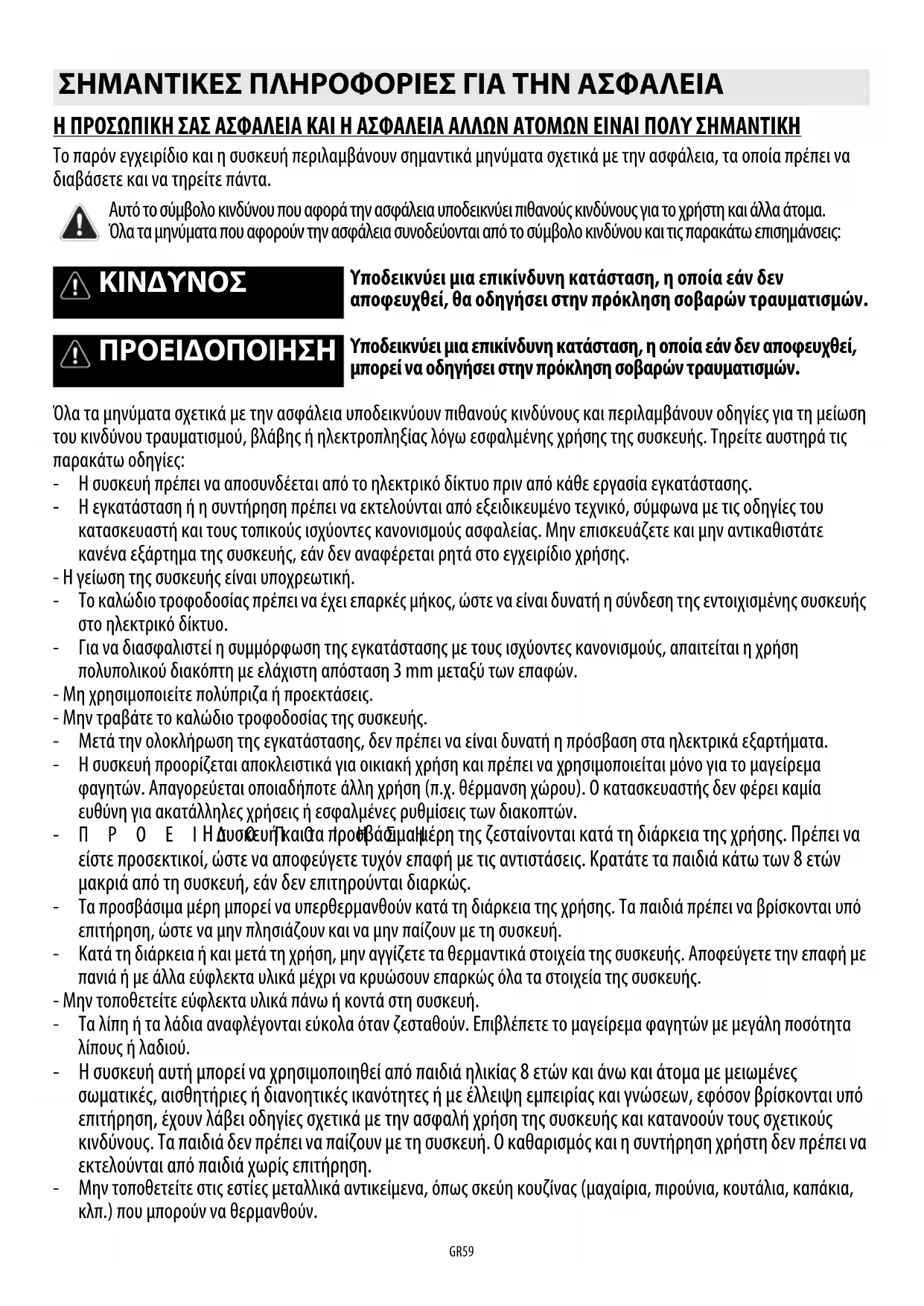 Ideale per il mantenimento in caldo di cibo appena cucinato, mantecare risotti e tenere in temperatura piatti di portata (con accessorio adatto all’induzione) OFF Potenza zero Superficie di appoggio Piano cottura in posizione di stand-by o spento (possibile presenza di calore residuo da fine cottura, segnalato con H)GR59 Η ΠΡΟΣΩΠΙΚΗ ΣΑΣ ΑΣΦΑΛΕΙΑ ΚΑΙ Η ΑΣΦΑΛΕΙΑ ΑΛΛΩΝ ΑΤΟΜΩΝ ΕΙΝΑΙ ΠΟΛΥ ΣΗΜΑΝΤΙΚΗ Το παρόν εγχειρίδιο και η συσκευή περιλαμβάνουν σημαντικά μηνύματα σχετικά με την ασφάλεια, τα οποία πρέπει να διαβάσετε και να τηρείτε πάντα. Όλα τα μηνύματα σχετικά με την ασφάλεια υποδεικνύουν πιθανούς κινδύνους και περιλαμβάνουν οδηγίες για τη μείωση του κινδύνου τραυματισμού, βλάβης ή ηλεκτροπληξίας λόγω εσφαλμένης χρήσης της συσκευής. Τηρείτε αυστηρά τις παρακάτω οδηγίες: - Η συσκευή πρέπει να αποσυνδέεται από το ηλεκτρικό δίκτυο πριν από κάθε εργασία εγκατάστασης. - Η εγκατάσταση ή η συντήρηση πρέπει να εκτελούνται από εξειδικευμένο τεχνικό, σύμφωνα με τις οδηγίες του κατασκευαστή και τους τοπικούς ισχύοντες κανονισμούς ασφαλείας. Μην επισκευάζετε και μην αντικαθιστάτε κανένα εξάρτημα της συσκευής, εάν δεν αναφέρεται ρητά στο εγχειρίδιο χρήσης. - Η γείωση της συσκευής είναι υποχρεωτική. - Το καλώδιο τροφοδοσίας πρέπει να έχει επαρκές μήκος, ώστε να είναι δυνατή η σύνδεση της εντοιχισμένης συσκευής στο ηλεκτρικό δίκτυο. - Για να διασφαλιστεί η συμμόρφωση της εγκατάστασης με τους ισχύοντες κανονισμούς, απαιτείται η χρήση πολυπολικού διακόπτη με ελάχιστη απόσταση 3 mm μεταξύ των επαφών. - Μη χρησιμοποιείτε πολύπριζα ή προεκτάσεις. - Μην τραβάτε το καλώδιο τροφοδοσίας της συσκευής. - Μετά την ολοκλήρωση της εγκατάστασης, δεν πρέπει να είναι δυνατή η πρόσβαση στα ηλεκτρικά εξαρτήματα. - Η συσκευή προορίζεται αποκλειστικά για οικιακή χρήση και πρέπει να χρησιμοποιείται μόνο για το μαγείρεμα φαγητών. Απαγορεύεται οποιαδήποτε άλλη χρήση (π.χ. θέρμανση χώρου). Ο κατασκευαστής δεν φέρει καμία ευθύνη για ακατάλληλες χρήσεις ή εσφαλμένες ρυθμίσεις των διακοπτών. -ΠΡΟΕΙΔΟΠΟΙΗΣΗ: Η συσκευή και τα προσβάσιμα μέρη της ζεσταίνονται κατά τη διάρκεια της χρήσης. Πρέπει να είστε προσεκτικοί, ώστε να αποφεύγετε τυχόν επαφή με τις αντιστάσεις. Κρατάτε τα παιδιά κάτω των 8 ετών μακριά από τη συσκευή, εάν δεν επιτηρούνται διαρκώς. - Τα προσβάσιμα μέρη μπορεί να υπερθερμανθούν κατά τη διάρκεια της χρήσης. Τα παιδιά πρέπει να βρίσκονται υπό επιτήρηση, ώστε να μην πλησιάζουν και να μην παίζουν με τη συσκευή. - Κατά τη διάρκεια ή και μετά τη χρήση, μην αγγίζετε τα θερμαντικά στοιχεία της συσκευής. Αποφεύγετε την επαφή με πανιά ή με άλλα εύφλεκτα υλικά μέχρι να κρυώσουν επαρκώς όλα τα στοιχεία της συσκευής. - Μην τοποθετείτε εύφλεκτα υλικά πάνω ή κοντά στη συσκευή. - Τα λίπη ή τα λάδια αναφλέγονται εύκολα όταν ζεσταθούν. Επιβλέπετε το μαγείρεμα φαγητών με μεγάλη ποσότητα λίπους ή λαδιού. - Η συσκευή αυτή μπορεί να χρησιμοποιηθεί από παιδιά ηλικίας 8 ετών και άνω και άτομα με μειωμένες σωματικές, αισθητήριες ή διανοητικές ικανότητες ή με έλλειψη εμπειρίας και γνώσεων, εφόσον βρίσκονται υπό επιτήρηση, έχουν λάβει οδηγίες σχετικά με την ασφαλή χρήση της συσκευής και κατανοούν τους σχετικούς κινδύνους. Τα παιδιά δεν πρέπει να παίζουν με τη συσκευή. Ο καθαρισμός και η συντήρηση χρήστη δεν πρέπει να εκτελούνται από παιδιά χωρίς επιτήρηση. - Μην τοποθετείτε στις εστίες μεταλλικά αντικείμενα, όπως σκεύη κουζίνας (μαχαίρια, πιρούνια, κουτάλια, καπάκια, κλπ.) που μπορούν να θερμανθούν. ΣΗΜΑΝΤΙΚΕΣ ΠΛΗΡΟΦΟΡΙΕΣ ΓΙΑ Τ