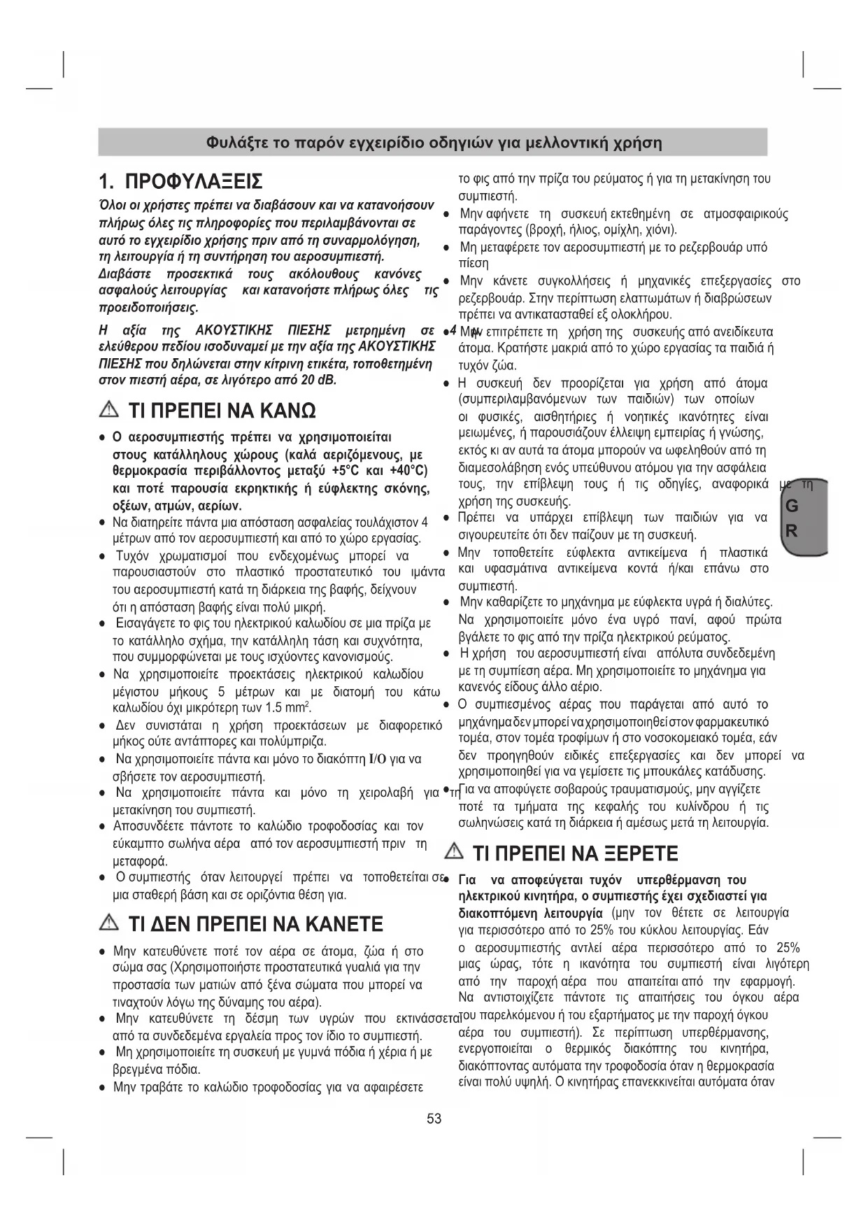 Όλοιοιχρήστεςπρέπειναδιαβάσουνκαινακατανοήσουν πλήρωςόλεςτιςπληροφορίεςπουπεριλαμβάνονταισε αυτότοεγχειρίδιοχρήσηςπριναπότησυναρμολόγηση, τηλειτουργίαήτησυντήρησητουαεροσυμπιεστή. Διαβάστε προσεκτικά τους ακόλουθους κανόνες ασφαλούςλειτουργίας καικατανοήστεπλήρωςόλες τις προειδοποιήσεις. Η αξία της ΑΚΟΥΣΤΙΚΗΣ ΠΙΕΣΗΣ μετρημένη σε 4 μ. ελεύθερουπεδίουισοδυναμείμετηναξίατηςΑΚΟΥΣΤΙΚΗΣ ΠΙΕΣΗΣπουδηλώνεταιστηνκίτρινηετικέτα,τοποθετημένη στονπιεστήαέρα,σελιγότεροαπό20dB. ΤΙ ΠΡΕΠΕΙ ΝΑ ΚΑΝΩ ● Ο αεροσυμπιεστής πρέπει να χρησιμοποιείται στους κατάλληλους χώρους (καλά αεριζόμενους, με θερμοκρασία περιβάλλοντος μεταξύ +5°C και +40°C) και ποτέ παρουσία εκρηκτικής ή εύφλεκτης σκόνης, οξέων, ατμών, αερίων.