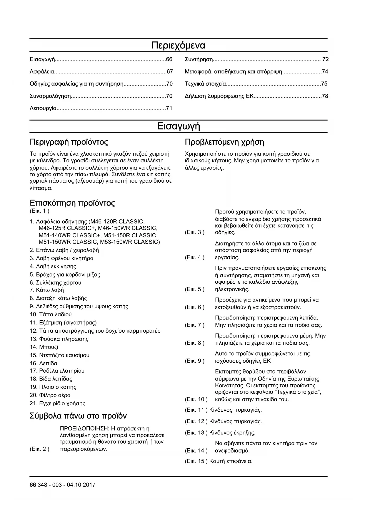 (Εικ. 5 ) Πριν πραγματοποιήσετε εργασίες επισκευής ή συντήρησης, σταματήστε τη μηχανή και αφαιρέστε το καλώδιο ανάφλεξης ηλεκτρονικής. (Εικ. 6 ) Προσέχετε για αντικείμενα που μπορεί να εκτοξευθούν ή να εξοστρακιστούν. (Εικ. 7 ) Προειδοποίηση: περιστρεφόμενη λεπίδα. Μην πλησιάζετε τα χέρια και τα πόδια σας. (Εικ. 8 ) Προειδοποίηση: περιστρεφόμενα μέρη. Μην πλησιάζετε τα χέρια και τα πόδια σας. (Εικ. 9 ) Αυτό το προϊόν συμμορφώνεται με τις ισχύουσες οδηγίες ΕΚ (Εικ. 10 ) Εκπομπές θορύβου στο περιβάλλον σύμφωνα με την Οδηγία της Ευρωπαϊκής Κοινότητας. Οι εκπομπές του προϊόντος ορίζονται στο κεφάλαιο "Τεχνικά στοιχεία", καθώς και στην πινακίδα του. (Εικ. 11 ) Κίνδυνος πυρκαγιάς. (Εικ. 12 ) Κίνδυνος πυρκαγιάς. (Εικ. 13 ) Κίνδυνος έκρηξης. (Εικ. 14 ) Να σβήνετε πάντα τον κινητήρα πριν τον ανεφοδιασμό. (Εικ. 15 ) Καυτή επιφάνεια. 66 348 - 003 - 04.10.2017(Εικ. 16 ) Οι αναθυμιάσεις της εξάτμισης από τον κινητήρα περιέχουν μονοξείδιο του άνθρακα, ένα άοσμο, δηλητηριώδες και ιδιαίτερα επικίνδυνο αέριο. Μην χρησιμοποιείτε το προϊόν σε εσωτερικούς ή κλειστούς