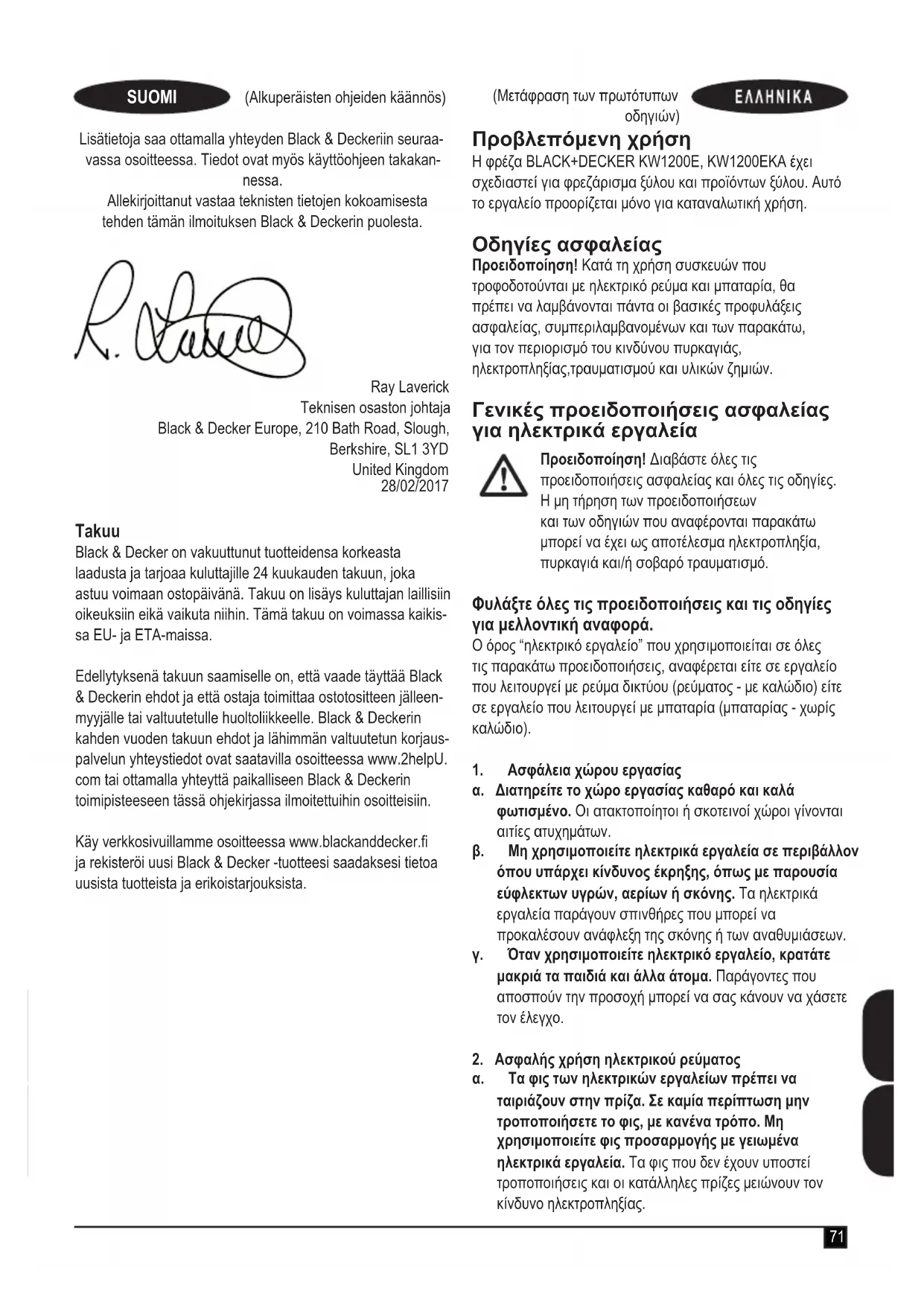 ΔήλωσησυμμόρφωσηςΕΚ ΟΔΗΓΙΑΠΕΡΙΜΗΧΑΝΩΝ Φρέζα KW1200E, KW1200EKA Η Black & Decker δηλώνει ότι τα προϊόντα αυτά που περιγράφονται στα “τεχνικά χαρακτηριστικά” συμμορφώνονται με τα ακόλουθα: 2006/42/EC, EN 60745-1:2009 + A11:2010, EN 60745-2-17:2010 Αυτά τα προϊόντα συμμορφώνονται επίσης με την οδηγία 2014/30/ΕΕ και 2011/65/ΕΕ. Για περισσότερες πληροφορίες, επικοινωνήστε με την Black & Decker στην παρακάτω διεύθυνση ή ανατρέξτε στο πίσω μέρος του εγχειριδίου.78 (Μετάφραση των πρωτότυπων οδηγιών) Ο κάτωθι υπογεγραμμένος είναι υπεύθυνος για την κατάρτιση του τεχνικού φακέλου και δηλώνει τα παρόντα εκ μέρους της Black & Decker. Ray Laverick Διευθυντής σχεδιασμού Black & Decker Europe, 210 Bath Road, Slough, Berkshire, SL1 3YD Ηνωμένο Βασίλειο 28/02/2017