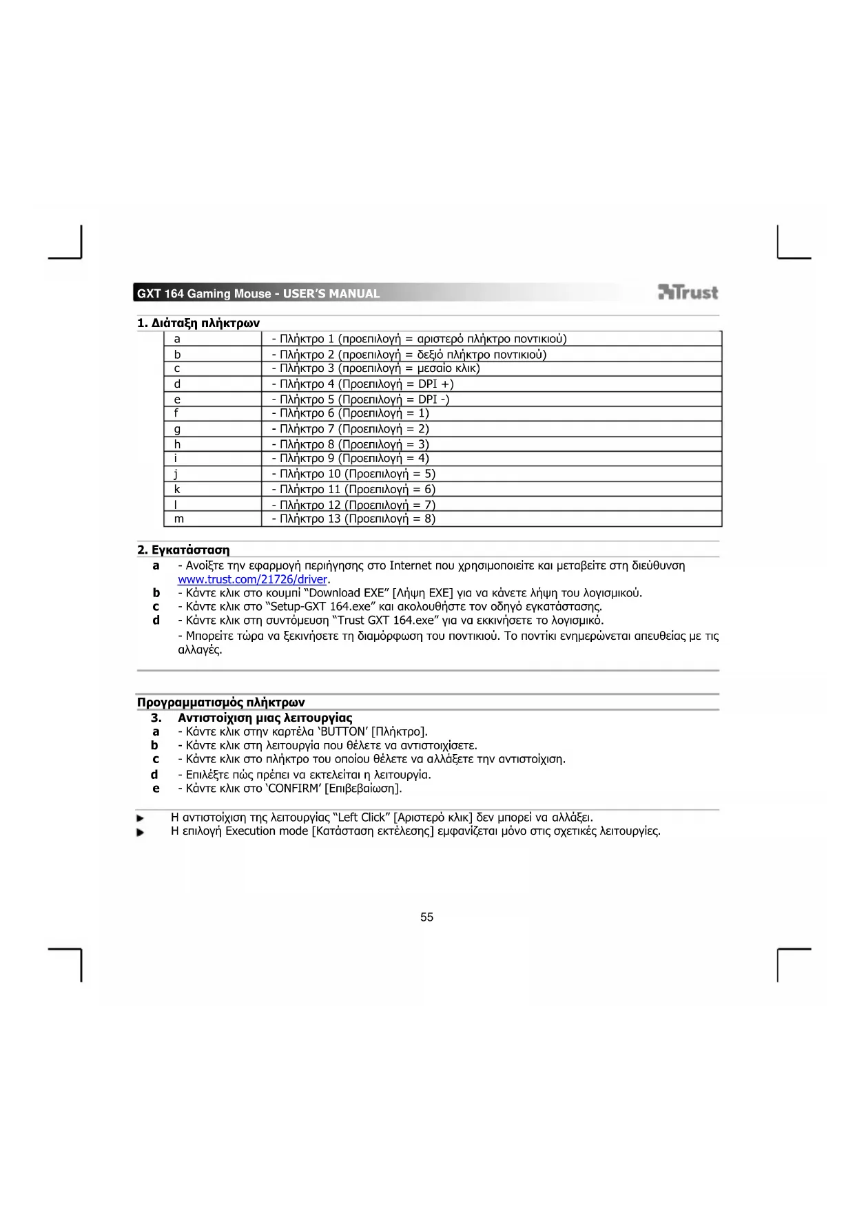 - Ανοίξτε την εφαρμογή περιήγησης στο Internet που χρησιμοποιείτε και μεταβείτε στη διεύθυνση www.trust.com/21726/driver. - Κάντε κλικ στο κουμπί “Download EXE” [Λήψη EXE] για να κάνετε λήψη του λογισμικού. - Κάντε κλικ στο “Setup-GXT 164.exe” και ακολουθήστε τον οδηγό εγκατάστασης. - Κάντε κλικ στη συντόμευση “Trust GXT 164.exe” για να εκκινήσετε το λογισμικό. - Μπορείτε τώρα να ξεκινήσετε τη διαμόρφωση του ποντικιού. Το ποντίκι ενημερώνεται απευθείας με τις