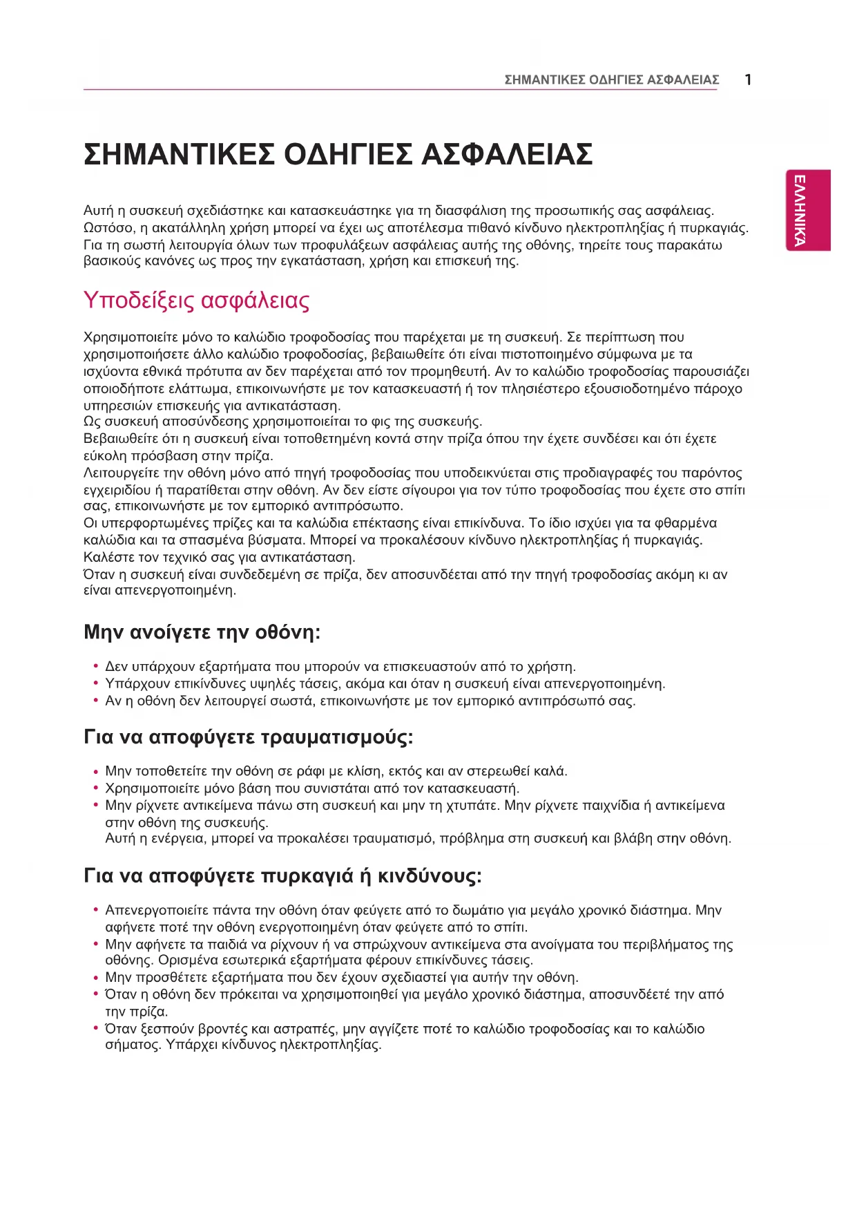 ΣΗΜΑΝΤΙΚΕΣ ΟΔΗΓΙΕΣ ΑΣΦΑΛΕΙΑΣ Υποδείξεις εγκατάστασης Μην αφήνετε αντικείμενα πάνω στο καλώδιο τροφοδοσίας και μην το συστρέφετε. Μην τοποθετείτε την οθόνη σε θέση όπου το καλώδιο τροφοδοσίας μπορεί να υποστεί βλάβη. Μην χρησιμοποιείτε την οθόνη κοντά σε νερό, δηλαδή κοντά σε μπανιέρα, νιπτήρα, νεροχύτη, υγρό υπόγειο