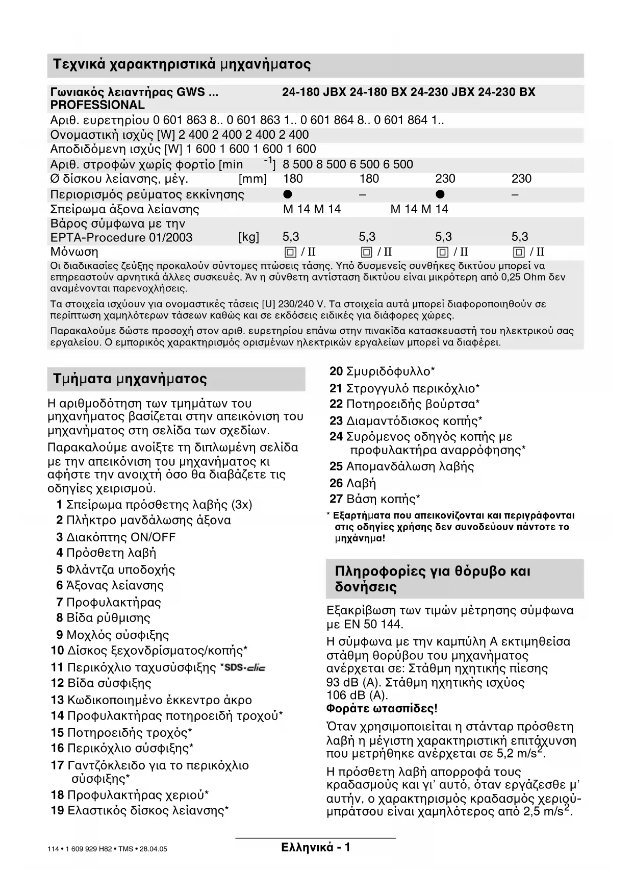 Τεχνικά χαρακτηριστικά µηχανήµατος Γωνιακ#ς λειαντήρας GWS ... PROFESSIONAL 24-180 JBX 24-180 BX 24-230 JBX 24-230 BX Αριθ. ευρετηρίου 0 601 863 8.. 0 601 863 1.. 0 601 864 8.. 0 601 864 1.. Ονοµαστική ισχύς [W] 2 400 2 400 2 400 2 400 Αποδιδµενη ισχύς [W] 1 600 1 600 1 600 1 600 Αριθ. στροφών χωρίς φορτίο [min