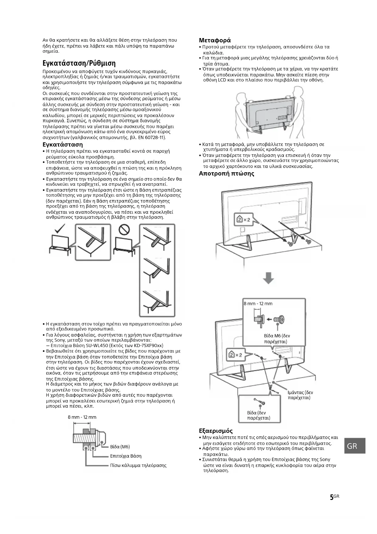 Για λόγους προστασίας και ασφάλειας του προϊόντος, η Sony συνιστά ένθερμα η εγκατάσταση της τηλεόρασής σας στον τοίχο να πραγματοποιηθεί από εξουσιοδοτημένους επαγγελματίες. Μην επιχειρήσετε να την εγκαταστήσετε μόνοι σας.