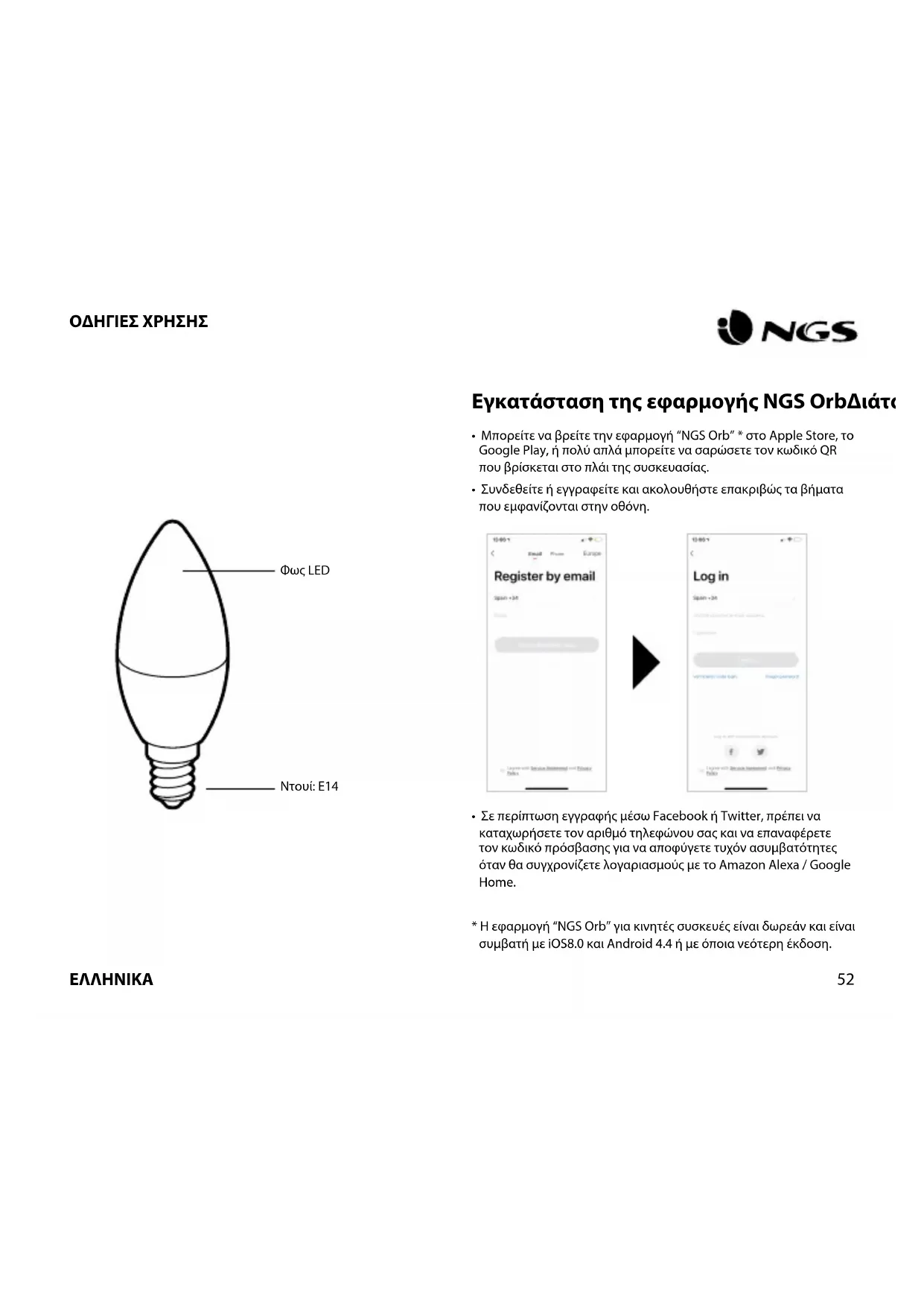 - ΣεπερίπτωσηεγγραφήςμέσωFacebookήTwitter,πρέπεινα καταχωρήσετετοναριθμότηλεφώνουσαςκαιναεπαναφέρετε τονκωδικόπρόσβασηςγιανααποφύγετετυχόνασυμβατότητες ότανθασυγχρονίζετελογαριασμούςμετοAmazonAlexa/Google Home. *Ηεφαρμογή“NGSOrb”γιακινητέςσυσκευέςείναιδωρεάνκαιείναι συμβατήμεiOS8.0καιAndroid4.4ήμεόποιανεότερηέκδοση. Ντουί:E14 ΦωςLED53