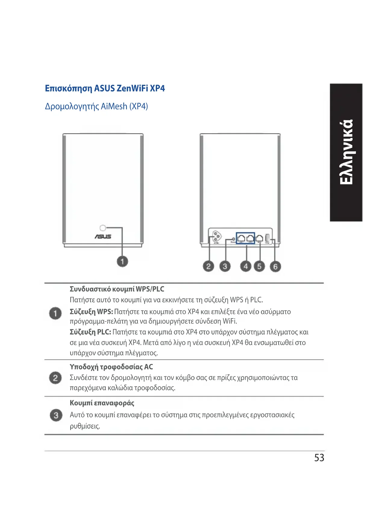 Επισκόπηση ASUS ZenWiFi XP4 Δρομολογητής AiMesh (XP4) Συνδυαστικό κουμπί WPS/PLC Πατήστε αυτό το κουμπί για να εκκινήσετε τη σύζευξη WPS ή PLC. Σύζευξη WPS: Πατήστε τα κουμπιά στο XP4 και επιλέξτε ένα νέο ασύρματο πρόγραμμα-πελάτη για να δημιουργήσετε σύνδεση WiFi. Σύζευξη PLC: Πατήστε τα κουμπιά στο XP4 στο υπάρχον σύστημα πλέγματος και σε μια νέα συσκευή XP4. Μετά από λίγο η νέα συσκευή XP4 θα ενσωματωθεί στο υπάρχον σύστημα πλέγματος. Υποδοχή τροφοδοσίας AC Συνδέστε τον δρομολογητή και τον κόμβο σας σε πρίζες χρησιμοποιώντας τα παρεχόμενα καλώδια τροφοδοσίας. Κουμπί επαναφοράς Αυτό το κουμπί επαναφέρει το σύστημα στις προεπιλεγμένες εργοστασιακές ρυθμίσεις.54