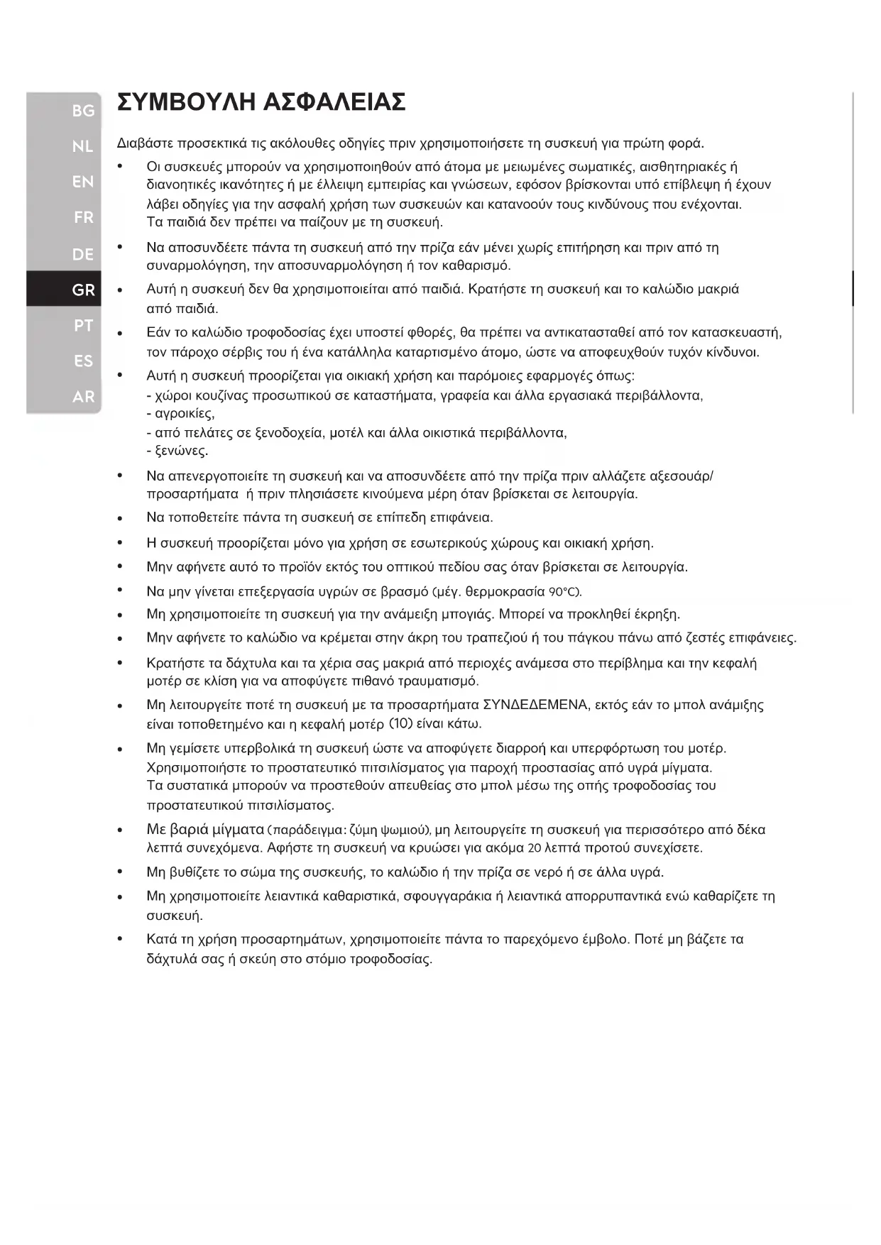 ΣΥΜΒΟΥΛΗ ΑΣΦΑΛΕΙΑΣ Διαβάστε προσεκτικά τις ακόλουθες οδηγίες πριν χρησιμοποιήσετε τη συσκευή για πρώτη φορά. Οι συσκευές μπορούν να χρησιμοποιηθούν από άτομα με μειωμένες σωματικές, αισθητηριακές ή διανοητικές ικανότητες ή με έλλειψη εμπειρίας και γνώσεων, εφόσον βρίσκονται υπό επίβλεψη ή έχουν λάβει οδηγίες για την ασφαλή χρήση των συσκευών και κατανοούν τους κινδύνους που ενέχονται. Τα παιδιά δεν πρέπει να παίζουν με τη συσκευή. Να αποσυνδέετε πάντα τη συσκευή από την πρίζα εάν μένει χωρίς επιτήρηση και πριν από τη συναρμολόγηση, την αποσυναρμολόγηση ή τον καθαρισμό. Αυτή η συσκευή δεν θα χρησιμοποιείται από παιδιά. Κρατήστε τη συσκευή και το καλώδιο μακριά από παιδιά. Εάν το καλώδιο τροφοδοσίας έχει υποστεί φθορές, θα πρέπει να αντικατασταθεί από τον κατασκευαστή, τον πάροχο σέρβις του ή ένα κατάλληλα καταρτισμένο άτομο, ώστε να αποφευχθούν τυχόν κίνδυνοι. Αυτή η συσκευή προορίζεται για οικιακή χρήση και παρόμοιες εφαρμογές όπως: - χώροι κουζίνας προσωπικού σε καταστήματα, γραφεία και άλλα εργασιακά περιβάλλοντα, - αγροικίες, - από πελάτες σε ξενοδοχεία, μοτέλ και άλλα οικιστικά περιβάλλοντα,