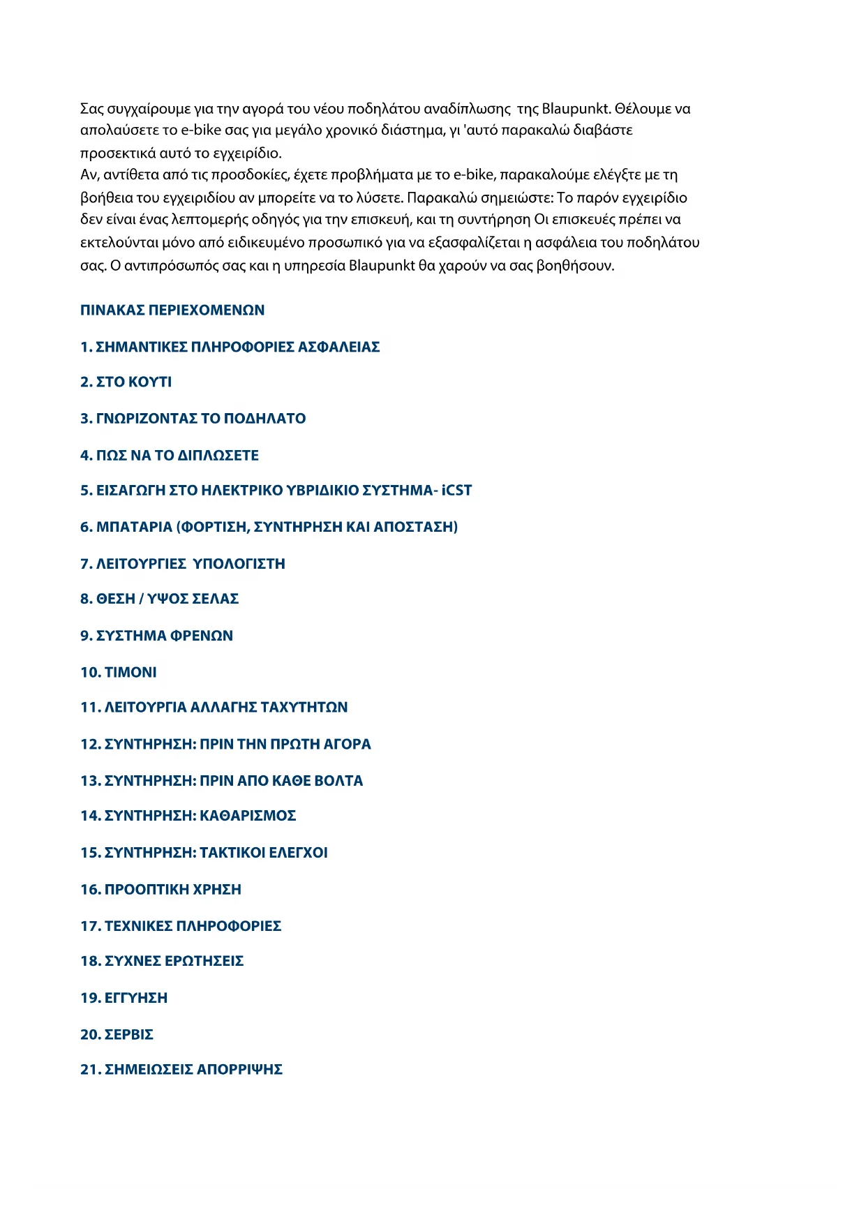 Rätten att göra tekniska ändringar förbehålles!Σας συγχαίρουμε για την αγορά του νέου ποδηλάτου αναδίπλωσης της Blaupunkt. Θέλουμε να απολαύσετε το e-bike σας για μεγάλο χρονικό διάστημα, γι 'αυτό παρακαλώ διαβάστε προσεκτικά αυτό το εγχειρίδιο. Αν, αντίθετα από τις προσδοκίες, έχετε προβλήματα με το e-bike, παρακαλούμε ελέγξτε με τη βοήθεια του εγχειριδίου αν μπορείτε να το λύσετε. Παρακαλώ σημειώστε: Το παρόν εγχειρίδιο δεν είναι ένας λεπτομερής οδηγός για την επισκευή, και τη συντήρηση Οι επισκευές πρέπει να εκτελούνται μόνο από ειδικευμένο προσωπικό για να εξασφαλίζεται η ασφάλεια του ποδηλάτου σας. Ο αντιπρόσωπός σας και η υπηρεσία Blaupunkt θα χαρούν να σας βοηθήσουν. ΠΙΝΑΚΑΣ ΠΕΡΙΕΧΟΜΕΝΩΝ