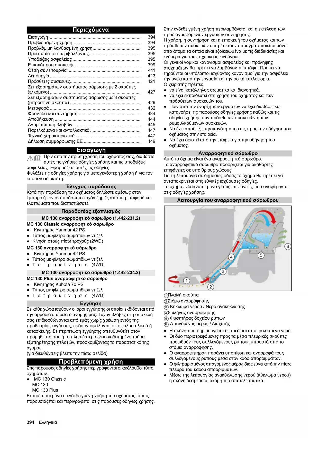 Πριν από την πρώτη χρήση του οχήματός σας, διαβάστε αυτές τις γνήσιες οδηγίες χρήσης και τις υποδείξεις ασφαλείας. Εφαρμόζετε αυτές τις οδηγίες. Φυλάξτε τις οδηγίες χρήσης για μεταγενέστερη χρήση ή για τον επόμενο ιδιοκτήτη. Έλεγχος παράδοσης Κατά την παράδοση του οχήματος δηλώστε αμέσως στον έμπορο ή τον αντιπρόσωπο τυχόν ζημιές από τη μεταφορά και ελαττώματα που διαπιστώσατε. Παραδοτέος εξοπλισμός MC 130 αναρροφητικό σάρωθρο (1.442-231.2) MC 130 Classic αναρροφητικό σάρωθρο ● Κινητήρας Yanmar 42 PS ●Τύπος με φίλτρο σωματιδίων ντίζελ ●Κίνηση στους πίσω τροχούς (2WD) MC 130 αναρροφητικό σάρωθρο ● Κινητήρας Yanmar 42 PS ●Τύπος με φίλτρο σωματιδίων ντίζελ ●Τετρακίνηση (4WD) MC 130 αναρροφητικό σάρωθρο (1.442-234.2) MC 130 Plus αναρροφητικό σάρωθρο ● Κινητήρας Kubota 70 PS ●Τύπος με φίλτρο σωματιδίων ντίζελ ●Τετρακίνηση (4WD)