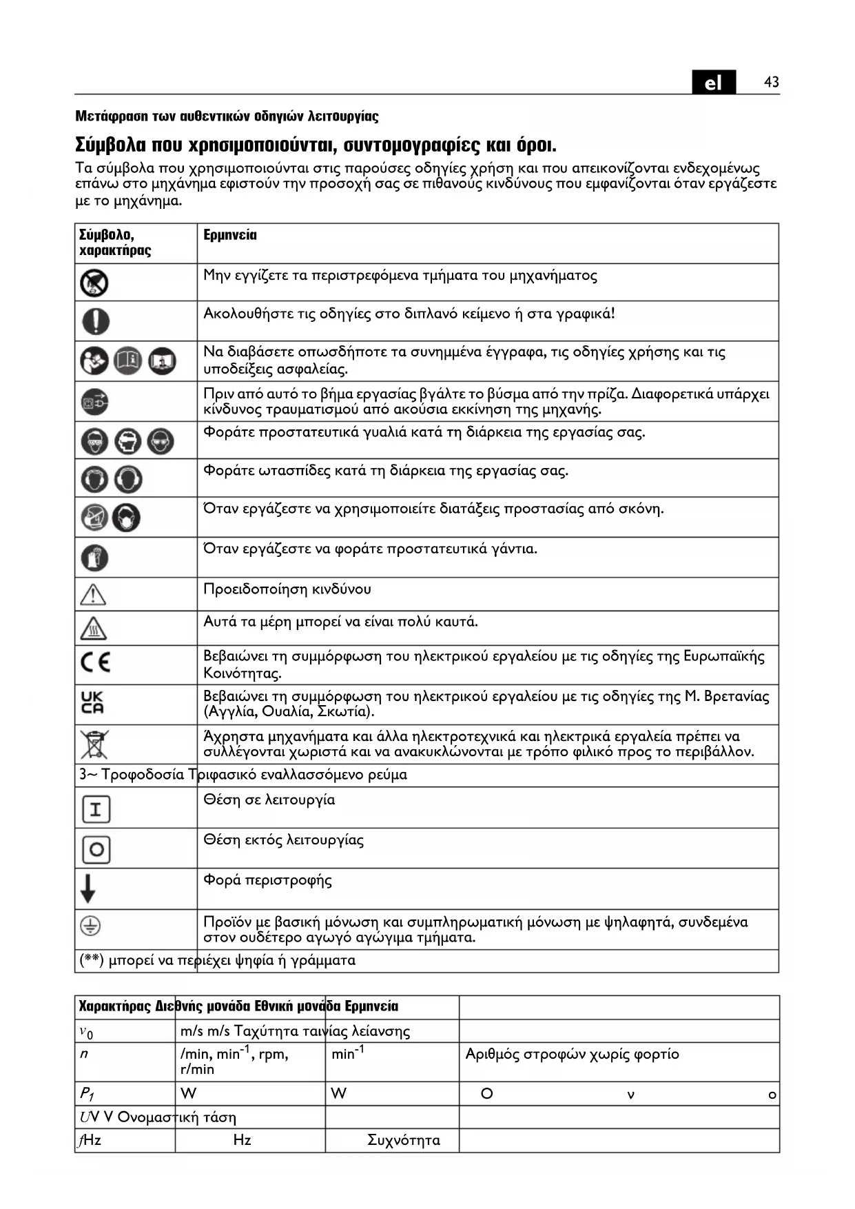 Μην εγγίζετε τα περιστρεφόμενα τμήματα του μηχανήματος Ακολουθήστε τις οδηγίες στο διπλανό κείμενο ή στα γραφικά! Να διαβάσετε οπωσδήποτε τα συνημμένα έγγραφα, τις οδηγίες χρήσης και τις υποδείξεις ασφαλείας. Πριν από αυτό το βήμα εργασίας βγάλτε το βύσμα από την πρίζα. Διαφορετικά υπάρχει κίνδυνος τραυματισμού από ακούσια εκκίνηση της μηχανής. Φοράτε προστατευτικά γυαλιά κατά τη διάρκεια της εργασίας σας. Φοράτε ωτασπίδες κατά τη διάρκεια της εργασίας σας. Όταν εργάζεστε να χρησιμοποιείτε διατάξεις προστασίας από σκόνη. Όταν εργάζεστε να φοράτε προστατευτικά γάντια. Προειδοποίηση κινδύνου Αυτά τα μέρη μπορεί να είναι πολύ καυτά. Βεβαιώνει τη συμμόρφωση του ηλεκτρικού εργαλείου με τις οδηγίες της Ευρωπαϊκής Κοινότητας. Βεβαιώνει τη συμμόρφωση του ηλεκτρικού εργαλείου με τις οδηγίες της Μ. Βρετανίας (Αγγλία, Ουαλία, Σκωτία). Άχρηστα μηχανήματα και άλλα ηλεκτροτεχνικά και ηλεκτρικά εργαλεία πρέπει να συλλέγονται χωριστά και να ανακυκλώνονται με τρόπο φιλικό προς το περιβάλλον. 3~ Τροφοδοσία Τριφασικό εναλλασσόμενο ρεύμα Θέση σε λειτουργία Θέση εκτός λειτουργίας Φορά περιστροφής Προϊόν με βασική μόνωση και συμπληρωματική μόνωση με ψηλαφητά, συνδεμένα στον ουδέτερο αγωγό αγώγιμα τμήματα. (**) μπορεί να περιέχει ψηφία ή γράμματα Χαρακτήρας Διεθνής μονάδα Εθνική μονάδα Ερμηνεία
