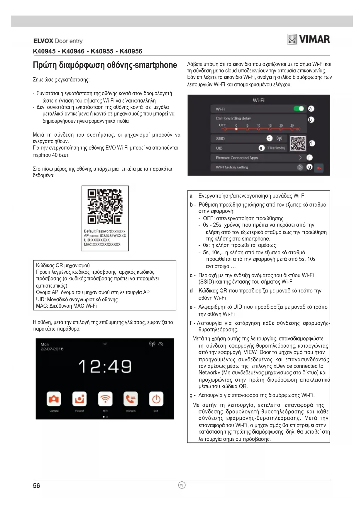 a - Ενεργοποίηση/απενεργοποίηση μονάδας Wi-Fi b - Ρύθμιση προώθησης κλήσης από τον εξωτερικό σταθμό στην εφαρμογή: - OFF: απενεργοποίηση προώθησης - 0s - 25s: χρόνος που πρέπει να περάσει από την κλήση από τον εξωτερικό σταθμό έως την προώθηση της κλήσης στο smartphone. - 0s: η κλήση προωθείται αμέσως - 5s, 10s,.. η κλήση από τον εξωτερικό σταθμό προωθείται από την εφαρμογή μετά από 5s, 10s αντίστοιχα … c - Περιοχή με την ένδειξη ονόματος του δικτύου Wi-Fi (SSID) και της έντασης του σήματος Wi-Fi d - Κώδικας QR που προσδιορίζει με μοναδικό τρόπο την οθόνη Wi-Fi e - Αλφαριθμητικό UID που προσδιορίζει με μοναδικό τρόπο την οθόνη Wi-Fi f - Λειτουργία για κατάργηση κάθε σύνδεσης εφαρμογής- θυροτηλεόρασης. Μετά τη χρήση αυτής της λειτουργίας, επαναδιαμορφώστε τη σύνδεση εφαρμογής-θυροτηλεόρασης, καταργώντας από την εφαρμογή VIEW Door το μηχανισμό που ήταν προηγουμένως συνδεδεμένος και επανασυνδέοντάς τον αμέσως μέσω της επιλογής «Device connected to Network» (Μη συνδεδεμένος μηχανισμός στο δίκτυο) και προχωρώντας στην πρώτη διαμόρφωση αποκλειστικά μέσω του κώδικα QR. g - Λειτουργία για επαναφορά της διαμόρφωσης Wi-Fi. Με αυτήν τη λειτουργία, εκτελείται επαναφορά της σύνδεσης δρομολογητή-θυροτηλεόρασης και κάθε σύνδεσης εφαρμογής-θυροτηλεόρασης. Μετά την επαναφορά του Wi-Fi, ο μηχανισμός θα επιστρέψει στην κατάσταση της πρώτης διαμόρφωσης, δηλ. θα μεταβεί στη λειτουργία σημείου πρόσβασης.57