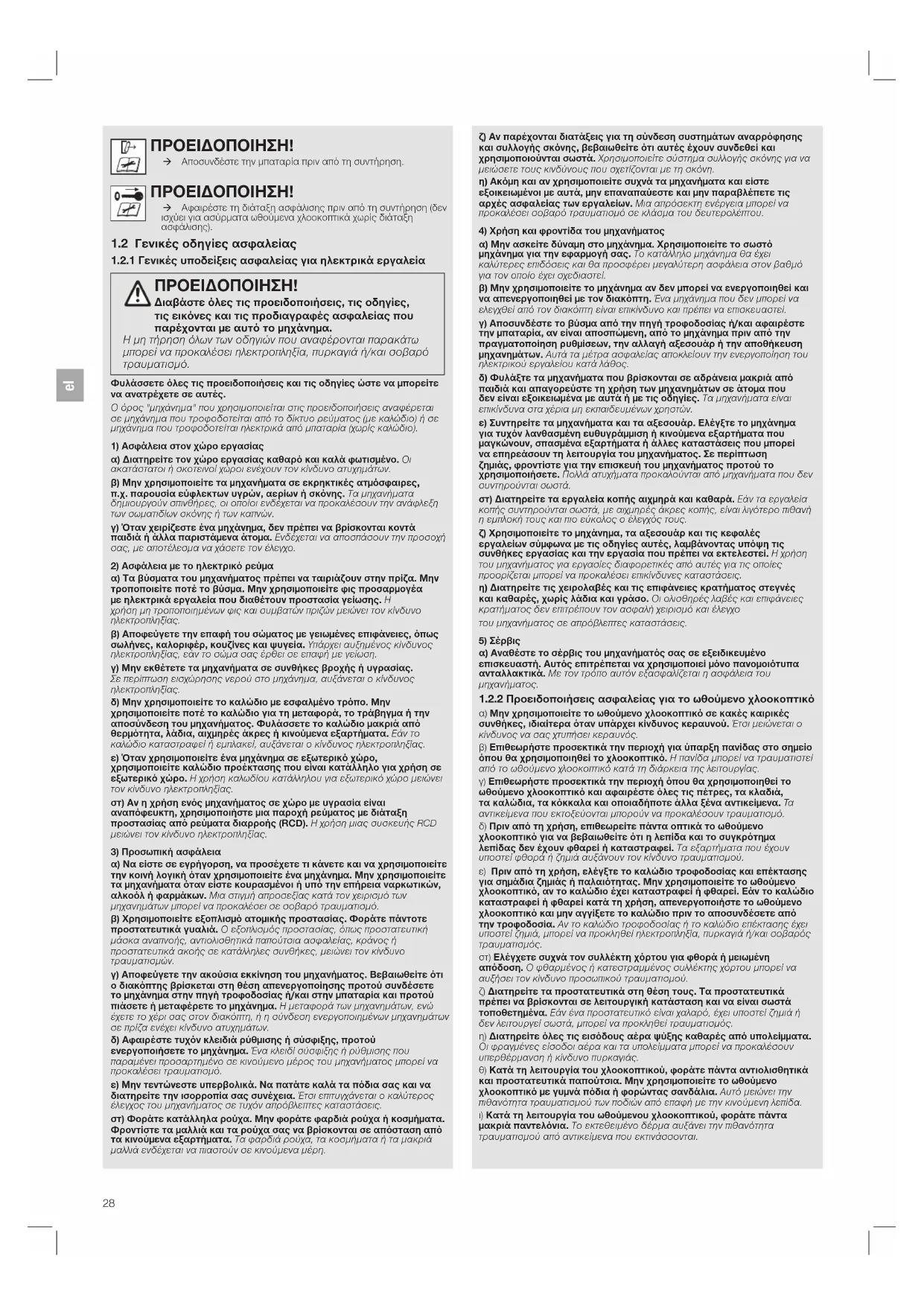 ΠΡΟΕΙΔΟΠΟΙΗΣΗ! Διαβάστε όλες τις προειδοποιήσεις, τις οδηγίες, τις εικόνες και τις προδιαγραφές ασφαλείας που παρέχονται με αυτό το μηχάνημα. Η μη τήρηση όλων των οδηγιών που αναφέρονται παρακάτω μπορεί να προκαλέσει ηλεκτροπληξία, πυρκαγιά ή/και σοβαρό τραυματισμό. Φυλάσσετε όλες τις προειδοποιήσεις και τις οδηγίες ώστε να μπορείτε να ανατρέχετε σε αυτές. Ο όρος "μηχάνημα" που χρησιμοποιείται στις προειδοποιήσεις αναφέρεται σε μηχάνημα που τροφοδοτείται από το δίκτυο ρεύματος (με καλώδιο) ή σε μηχάνημα που τροφοδοτείται ηλεκτρικά από μπαταρία (χωρίς καλώδιο).