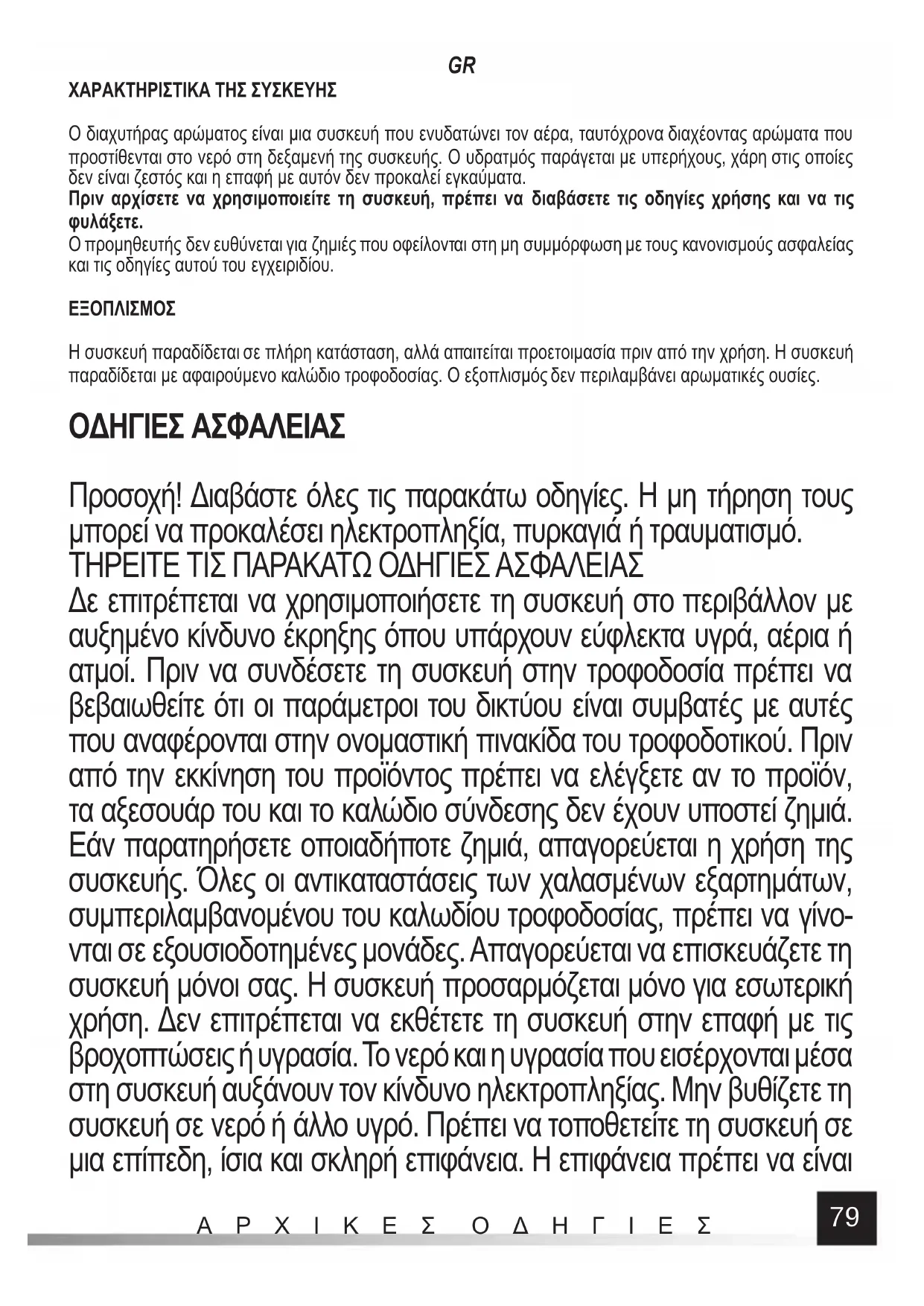 Η συσκευή παραδίδεται σε πλήρη κατάσταση, αλλά απαιτείται προετοιμασία πριν από την χρήση. Η συσκευή παραδίδεται με αφαιρούμενο καλώδιο τροφοδοσίας. Ο εξοπλισμός δεν περιλαμβάνει αρωματικές ουσίες. ΟΔΗΓΙΕΣ ΑΣΦΑΛΕΙΑΣ Προσοχή! Διαβάστε όλες τις παρακάτω οδηγίες. Η μη τήρηση τους μπορεί να προκαλέσει ηλεκτροπληξία, πυρκαγιά ή τραυματισμό. ΤΗΡΕΙΤΕ ΤΙΣ ΠΑΡΑΚΑΤΩ ΟΔΗΓΙΕΣ ΑΣΦΑΛΕΙΑΣ Δε επιτρέπεται να χρησιμοποιήσετε τη συσκευή στο περιβάλλον με αυξημένο κίνδυνο έκρηξης όπου υπάρχουν εύφλεκτα υγρά, αέρια ή ατμοί. Πριν να συνδέσετε τη συσκευή στην τροφοδοσία πρέπει να βεβαιωθείτε ότι οι παράμετροι του δικτύου είναι συμβατές με αυτές που αναφέρονται στην ονομαστική πινακίδα του τροφοδοτικού. Πριν από την εκκίνηση του προϊόντος πρέπει να ελέγξετε αν το προϊόν, τα αξεσουάρ του και το καλώδιο σύνδεσης δεν έχουν υποστεί ζημιά. Εάν παρατηρήσετε οποιαδήποτε ζημιά, απαγορεύεται η χρήση της συσκευής. Όλες οι αντικαταστάσεις των χαλασμένων εξαρτημάτων, συμπεριλαμβανομένου του καλωδίου τροφοδοσίας, πρέπει να γίνο- νται σε εξουσιοδοτημένες μονάδες. Απαγορεύεται να επισκευάζετε τη συσκευή μόνοι σας. Η συσκευή προσαρμόζεται μόνο για εσωτερική χρήση. Δεν επιτρέπεται να εκθέτετε τη συσκευή στην επαφή με τις βροχοπτώσεις ή υγρασία. Το νερό και η υγρασία που εισέρχονται μέσα στη συσκευή αυξάνουν τον κίνδυνο ηλεκτροπληξίας. Μην βυθίζετε τη συσκευή σε νερό ή άλλο υγρό. Πρέπει να τοποθετείτε τη συσκευή σε μια επίπεδη, ίσια και σκληρή επιφάνεια. Η επιφάνεια πρέπει να είναι80 ΑΡΧΙΚΕΣ ΟΔΗΓΙΕΣ