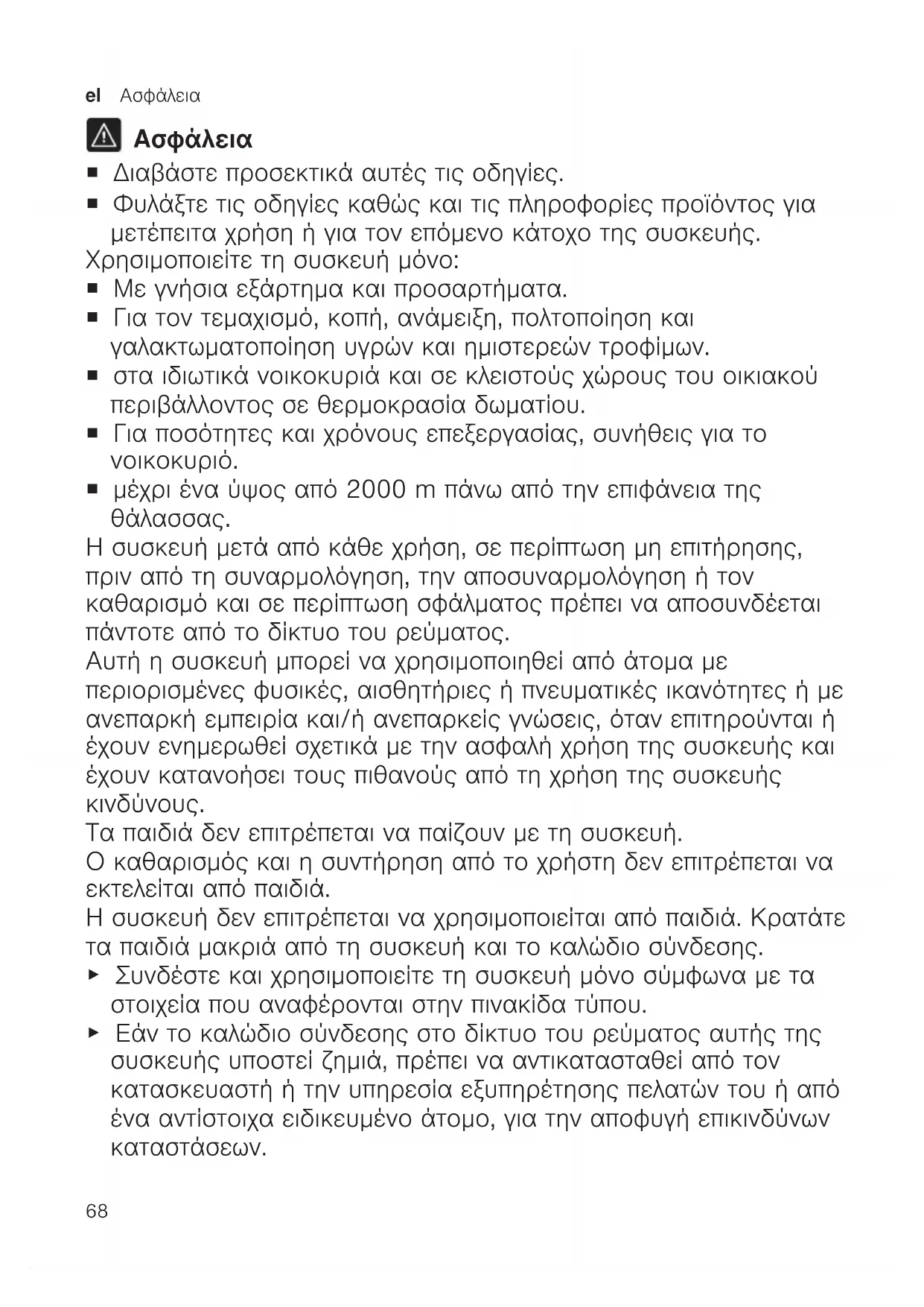 ¡ Διαβάστε προσεκτικά αυτές τις οδηγίες. ¡ Φυλάξτε τις οδηγίες καθώς και τις πληροφορίες προϊόντος για μετέπειτα χρήση ή για τον επόμενο κάτοχο της συσκευής. Χρησιμοποιείτε τη συσκευή μόνο: ¡ Με γνήσια εξάρτημα και προσαρτήματα. ¡ Για τον τεμαχισμό, κοπή, ανάμειξη, πολτοποίηση και γαλακτωματοποίηση υγρών και ημιστερεών τροφίμων. ¡ στα ιδιωτικά νοικοκυριά και σε κλειστούς χώρους του οικιακού περιβάλλοντος σε θερμοκρασία δωματίου. ¡ Για ποσότητες και χρόνους επεξεργασίας, συνήθεις για το νοικοκυριό. ¡ μέχρι ένα ύψος από 2000 m πάνω από την επιφάνεια της