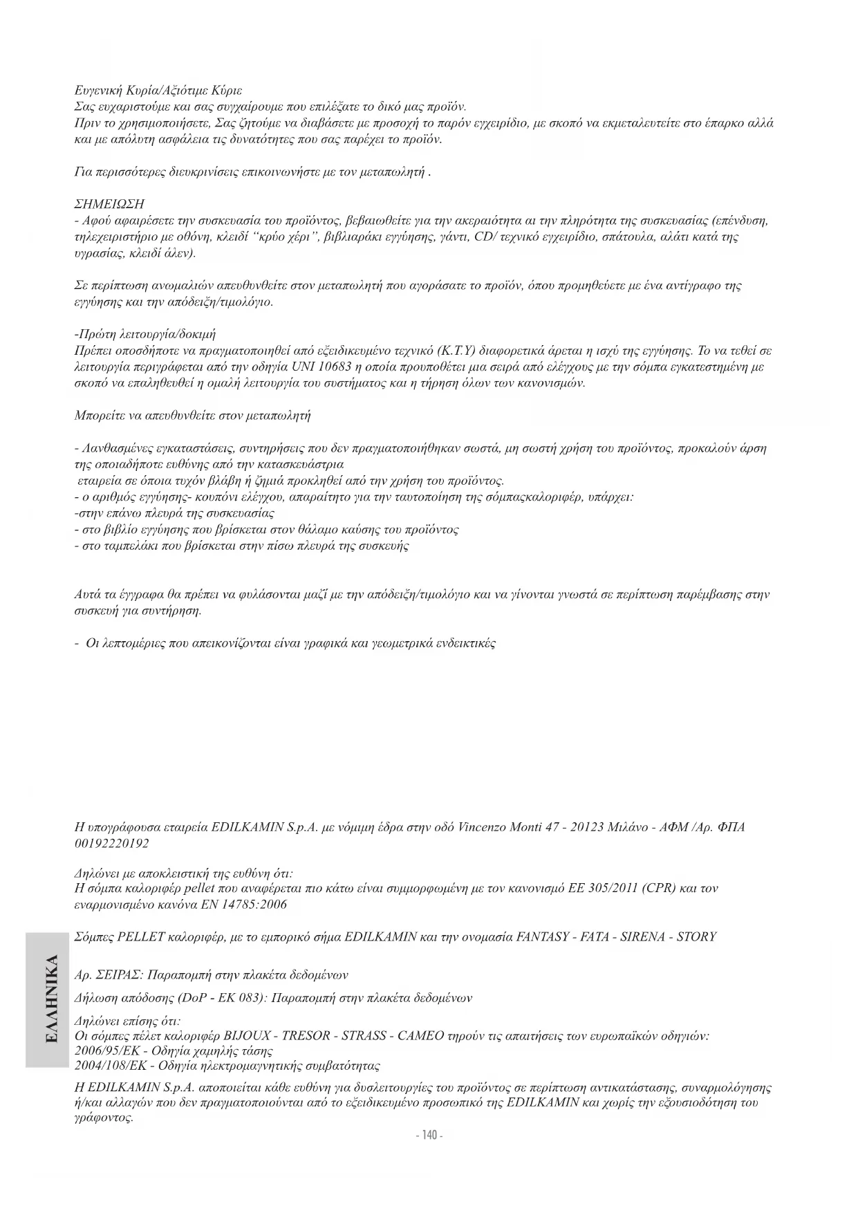 Δηλώνει με αποκλειστική της ευθύνη ότι: Η σόμπα καλοριφέρ pellet που αναφέρεται πιο κάτω είναι συμμορφωμένη με τον κανονισμό ΕΕ 305/2011 (CPR) και τον εναρμονισμένο κανόνα ΕΝ 14785:2006 Σόμπες PELLET καλοριφέρ, με το εμπορικό σήμα EDILKAMIN και την ονομασία FANTASY - FATA - SIRENA - STORY Αρ. ΣΕΙΡΑΣ: Παραπομπή στην πλακέτα δεδομένων Δήλωση απόδοσης (DoP - EK 083): Παραπομπή στην πλακέτα δεδομένων Δηλώνει επίσης ότι: Οι σόμπες πέλετ καλοριφέρ BIJOUX - TRESOR - STRASS - CAMEO τηρούν τις απαιτήσεις των ευρωπαϊκών οδηγιών: 2006/95/ΕΚ - Οδηγία χαμηλής τάσης 2004/108/ΕΚ - Οδηγία ηλεκτρομαγνητικής συμβατότητας Η EDILKAMIN S.p.A. αποποιείται κάθε ευθύνη για δυσλειτουργίες του προϊόντος σε περίπτωση αντικατάστασης, συναρμολόγησης ή/και αλλαγών που δεν πραγματοποιούνται από το εξειδικευμένο προσωπικό της EDILKAMIN και χωρίς την εξουσιοδότηση του γράφοντος.ΕΛΛΗΝΙΚΑ