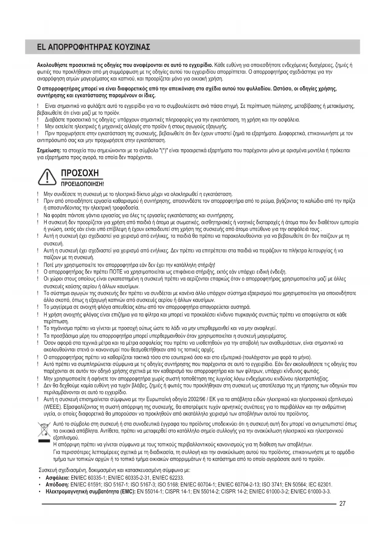 ! Το τηγάνισμα πρέπει να γίνεται με προσοχή ούτως ώστε το λάδι να μην υπερθερμανθεί και να μην αναφλεγεί. ! Τα προσβάσιμα μέρη του απορροφητήρα μπορεί υπερθερμανθούν όταν χρησιμοποιείται η συσκευή μαγειρέματος. ! Όσον αφορά στα τεχνικά μέτρα και τα μέτρα ασφαλείας που πρέπει να υιοθετηθούν για την αποβολή των αναθυμιάσεων, είναι σημαντικό να ακολουθούνται στενά οι κανονισμοί που θεσμοθετήθηκαν από τις τοπικές αρχές. ! Ο απορροφητήρας πρέπει να καθαρίζεται τακτικά τόσο στο εσωτερικό όσο και στο εξωτερικό (τουλάχιστον μια φορά το μήνα). ! Αυτό πρέπει να συμπληρώνεται σύμφωνα με τις οδηγίες συντήρησης που παρέχονται σε αυτό το εγχειρίδιο. Εάν δεν ακολουθήσετε τις οδηγίες που παρέχονται σε αυτόν τον οδηγό χρήσης σχετικά με τον καθαρισμό του απορροφητήρα και των φίλτρων, υπάρχει κίνδυνος φωτιάς. ! Μην χρησιμοποιείτε ή αφήνετε τον απορροφητήρα χωρίς σωστή τοποθέτηση της λυχνίας λόγω ενδεχόμενου κινδύνου ηλεκτροπληξίας. ! Δεν θα δεχθούμε καμία ευθύνη για τυχόν βλάβες, ζημιές ή φωτιές που προκλήθηκαν στη συσκευή ως αποτέλεσμα της μη τήρησης των οδηγιών που περιλαμβάνονται σε αυτό το εγχειρίδιο. ! Αυτή η συσκευή επισημαίνεται σύμφωνα με την Ευρωπαϊκή οδηγία 2002/96 / ΕΚ για τα απόβλητα ειδών ηλεκτρικού και ηλεκτρονικού εξοπλισμού (WEEE). Εξασφαλίζοντας τη σωστή απόρριψη της συσκευής, θα αποτρέψετε τυχόν αρνητικές συνέπειες για το περιβάλλον και την ανθρώπινη υγεία, οι οποίες διαφορετικά θα μπορούσαν να προκληθούν από ακατάλληλο χειρισμό των αποβλήτων αυτού του προϊόντος. Ο απορροφητήρας μπορεί να είναι διαφορετικός από την απεικόνιση στα σχέδια αυτού του φυλλαδίου. Ωστόσο, οι οδηγίες χρήσης, συντήρησης και εγκατάστασης παραμένουν οι ίδιες.