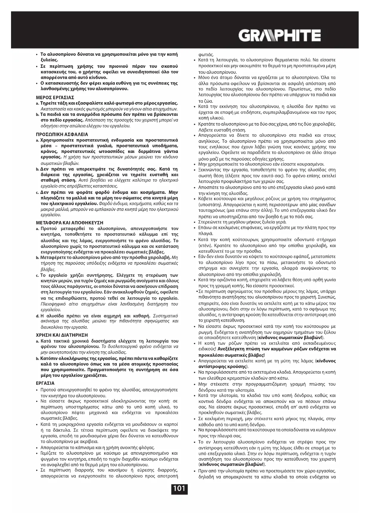 - Απαγορεύεται να εργάζονται με το αλυσοπρίονο πρόσωπα που δεν έχουν λάβει γνώση του περιεχόμενου των παρουσών οδηγιών.101