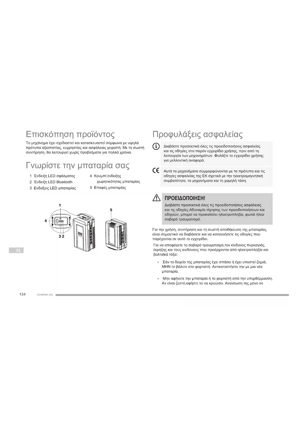 ΠΡΟΕΙΔΟΠΟΙΗΣΗ! Αν το γκρουπ της μπαταρίας ραγίσει ή σπάσει , με ή χωρίς απώλειαυγρών , μην το φορτώσετε και μην το επαναχρησιμοποιήσετε . Αποικοδομήστε το και αντικαταστήστε το με ένα νέο γκρουπ μπαταρίας. ΜΗΝ ΠΡΟΣΠΑΘΗΣΕ ΤΕ ΝΑ ΤΟ ΔΙΟΡΘΩΣΕΤΕ !137 cramer.eu