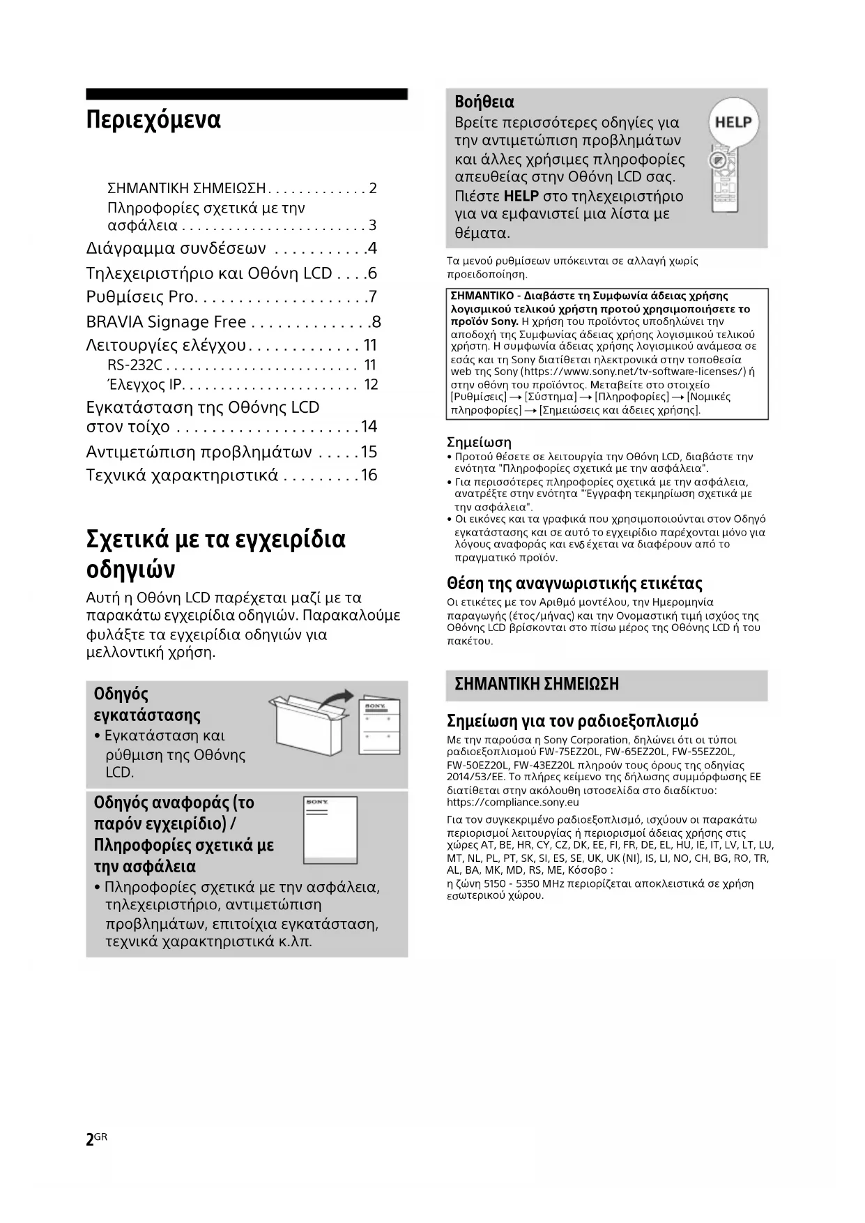 έχεται να διαφέρουν από το πραγματικό προϊόν. Θέση της αναγνωριστικής ετικέτας Οι ετικέτες με τον Αριθμό μοντέλου, την Ημερομηνία παραγωγής (έτος/μήνας) και την Ονομαστική τιμή ισχύος της Οθόνης LCD βρίσκονται στο πίσω μέρος της Οθόνης LCD ή του Σημείωση για τον ραδιοεξοπλισμό Με την παρούσα η Sony Corporation, δηλώνει ότι οι τύποι ραδιοεξοπλισμού FW-75EZ20L, FW-65EZ20L, FW-55EZ20L, FW-50EZ20L, FW-43EZ20L πληρούν τους όρους της οδηγίας 2014/53/ΕΕ. Το πλήρες κείμενο της δήλωσης συμμόρφωσης ΕΕ διατίθεται στην ακόλουθη ιστοσελίδα στο διαδίκτυο: https://compliance.sony.eu Για τον συγκεκριμένο ραδιοεξοπλισμό, ισχύουν οι παρακάτω περιορισμοί λειτουργίας ή περιορισμοί άδειας χρήσης στις χώρες AT, BE, HR, CY, CZ, DK, EE, FI, FR, DE, EL, HU, IE, IT, LV, LT, LU, MT, NL, PL, PT, SK, SI, ES, SE, UK, UK (NI), IS, LI, NO, CH, BG, RO, TR, AL, BA, MK, MD, RS, ME, Κόσοβο : η ζώνη 5150 - 5350 MHz περιορίζεται αποκλειστικά σε χρήσ