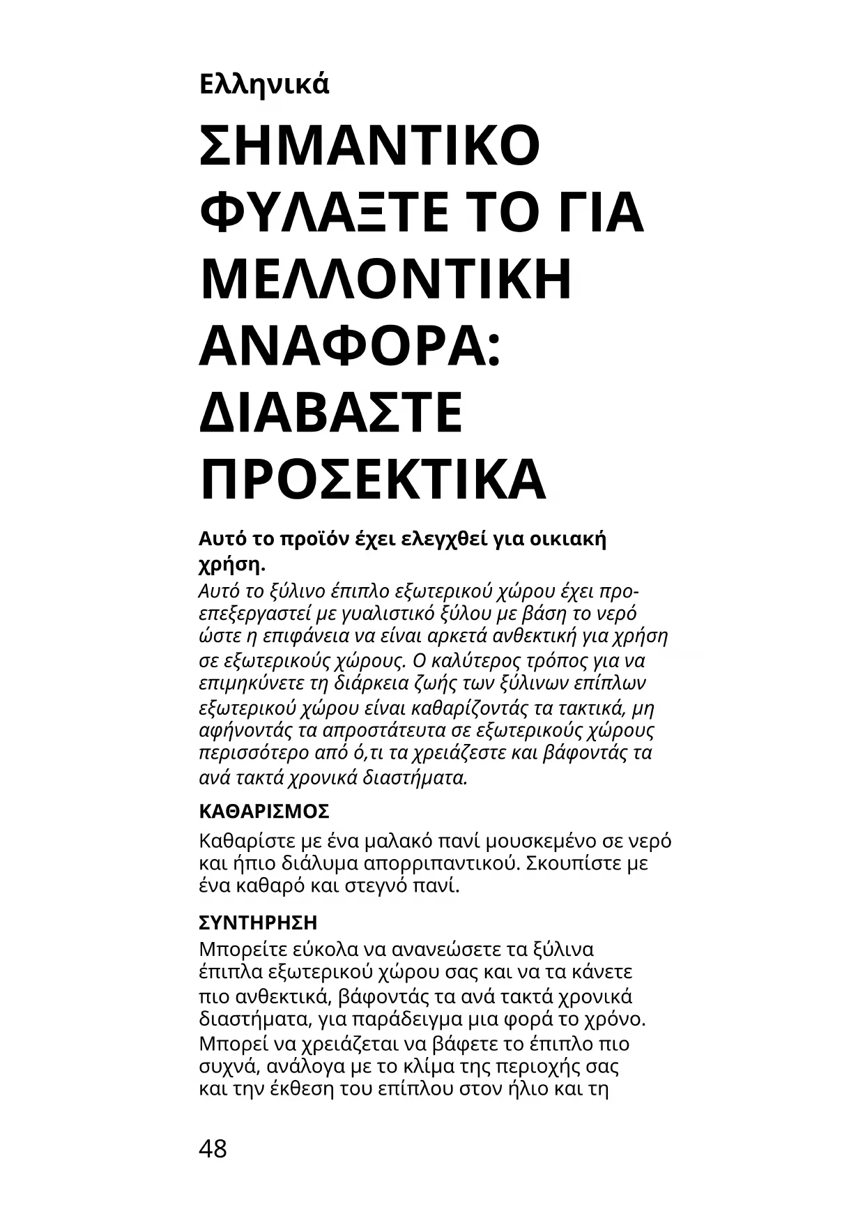 Αποθήκευση: Πριν αποθηκεύσετε το έπιπλό σας, καθαρίστε το και αφήστε το να στεγνώσει καλά. Αν είναι δυνατόν, αποθηκεύστε το έπιπλο εξωτερικού χώρου σε ένα δροσερό και στεγνό εσωτερικό χώρο. Αν το αποθηκεύσετε σε εξωτερικό χώρο, τοποθετήστε το κάτω από κάποιο στέγαστρο, αν50 είναι δυνατόν και τοποθετήστε ένα προστατευτικό κάλυμμα. Αν το έπιπλο μείνει εκτεθειμένο στα καιρικά φαινόμενα, βεβαιωθείτε ότι είναι καλυμμένο με ένα αδιάβροχο κάλυμμα και αν είναι δυνατόν, στηρίξτε το με τρόπο ώστε να έχει κάποια κλίση. Μετά από κάποια βροχή ή χιόνι, σκουπίστε τα υπολείμματα, ειδικά από τις επίπεδες επιφάνειες. Βεβαιωθείτε ότι ο αέρας κυκλοφορεί, ώστε να αποφύγετε την υγρασία.