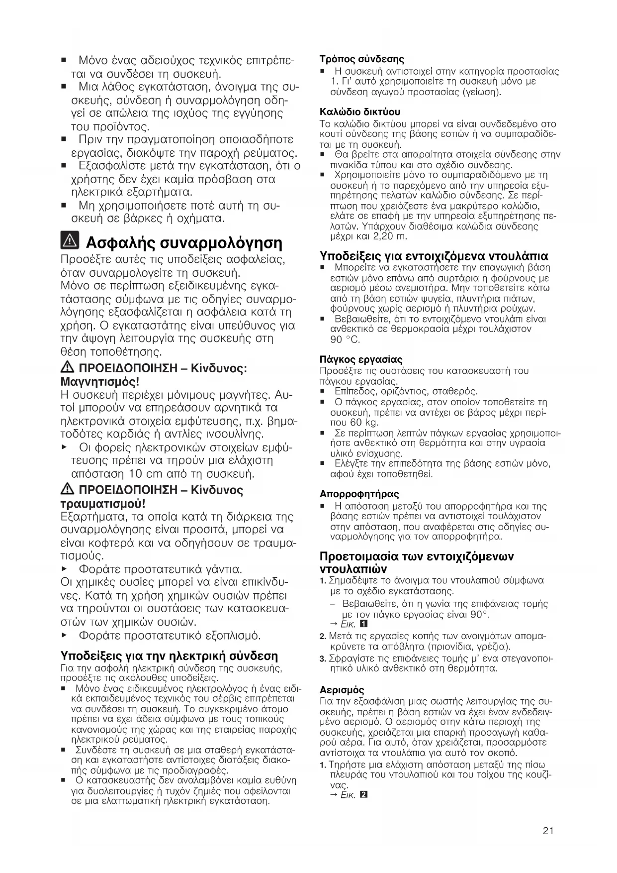 Γενικές υποδείξεις ¡ Διαβάστε προσεκτικά αυτές τις οδηγίες.21 ¡ Μόνο ένας αδειούχος τεχνικός επιτρέπε- ται να συνδέσει τη συσκευή. ¡ Μια λάθος εγκατάσταση, άνοιγμα της συ- σκευής, σύνδεση ή συναρμολόγηση οδη- γεί σε απώλεια της ισχύος της εγγύησης του προϊόντος. ¡ Πριν την πραγματοποίηση οποιασδήποτε εργασίας, διακόψτε την παροχή ρεύματος. ¡ Εξασφαλίστε μετά την εγκατάσταση, ότι ο χρήστης δεν έχει καμία πρόσβαση στα ηλεκτρικά εξαρτήματα. ¡ Μη χρησιμοποιήσετε ποτέ αυτή τη συ- σκευή σε βάρκες ή οχήματα. Ασφαλής συναρμολόγηση Προσέξτε αυτές τις υποδείξεις ασφαλείας, όταν συναρμολογείτε τη συσκευή. Μόνο σε περίπτωση εξειδικευμένης εγκα- τάστασης σύμφωνα με τις οδηγίες συναρμο- λόγησης εξασφαλίζεται η ασφάλεια κατά τη χρήση. Ο εγκαταστάτης είναι υπεύθυνος για την άψογη λειτουργία της συσκευής στη θέση τοποθέτησης. ΠΡΟΕΙΔΟΠΟΙΗΣΗ‒Κίνδυνος: Μαγνητισμός! Η συσκευή περιέχει μόνιμους μαγνήτες. Αυ- τοί μπορούν να επηρεάσουν αρνητικά τα ηλεκτρονικά στοιχεία εμφύτευσης, π.χ. βημα- τοδότες καρδιάς ή αντλίες ινσουλίνης. ▶ Οι φορείς ηλεκτρονικών στοιχείων εμφύ- τευσης πρέπει να τηρούν μια ελάχιστη απόσταση 10 cm από τη συσκευή. ΠΡΟΕΙΔΟΠΟΙΗΣΗ‒Κίνδυνος τραυματισμού! Εξαρτήματα, τα οποία κατά τη διάρκεια της συναρμολόγησης είναι προσιτά, μπορεί να είναι κοφτερά και να οδηγήσουν σε τραυμα-