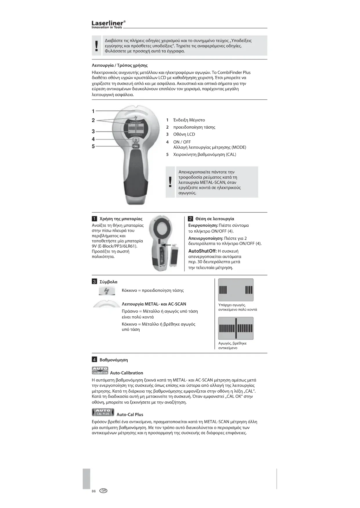 Ηλεκτρονικός ανιχνευτής μετάλλου και ηλεκτροφόρων αγωγών. Tο CombiFinder Plus διαθέτει οθόνη υγρών κρυστάλλων LCD με καθοδήγηση χειριστή. Έτσι μπορείτε να χειρίζεστε τη συσκευή απλά και με ασφάλεια. Ακουστικά και οπτικά σήματα για την εύρεση αντικειμένων διευκολύνουν επιπλέον τον χειρισμό, παρέχοντας μεγάλη λειτουργική ασφάλεια. Auto-Calibration Η αυτόματη βαθμονόμηση ξεκινά κατά τη METAL- και AC-SCAN μέτρηση αμέσως μετά την ενεργοποίηση της συσκευής όπως επίσης και ύστερα από αλλαγή της λειτουργίας μέτρησης. Κατά τη διάρκεια της βαθμονόμησης εμφανίζεται στην οθόνη η λέξη „CAL“. Κατά τη διαδικασία αυτή μη μετακινείτε τη συσκευή. Όταν εμφανιστεί „CAL OK“ στην οθόνη, μπορείτε να ξεκινήσετε με την αναζήτηση. Auto-Cal Plus Εφόσον βρεθεί ένα αντικείμενο, πραγματοποιείται κατά τη METAL-SCAN μέτρηση άλλη μία αυτόματη βαθμονόμηση. Με τον τρόπο αυτό διευκολύνεται ο περιορισμός των αντικειμένων μέτρησης και η προσαρμογή της συσκευής σε διάφορες επιφάνειες. Λειτουργία METAL- και AC-SCAN Πράσινο = Μέταλλο ή αγωγός υπό τάση είναι πολύ κοντά Κόκκινο = Μέταλλο ή βρέθηκε αγωγός