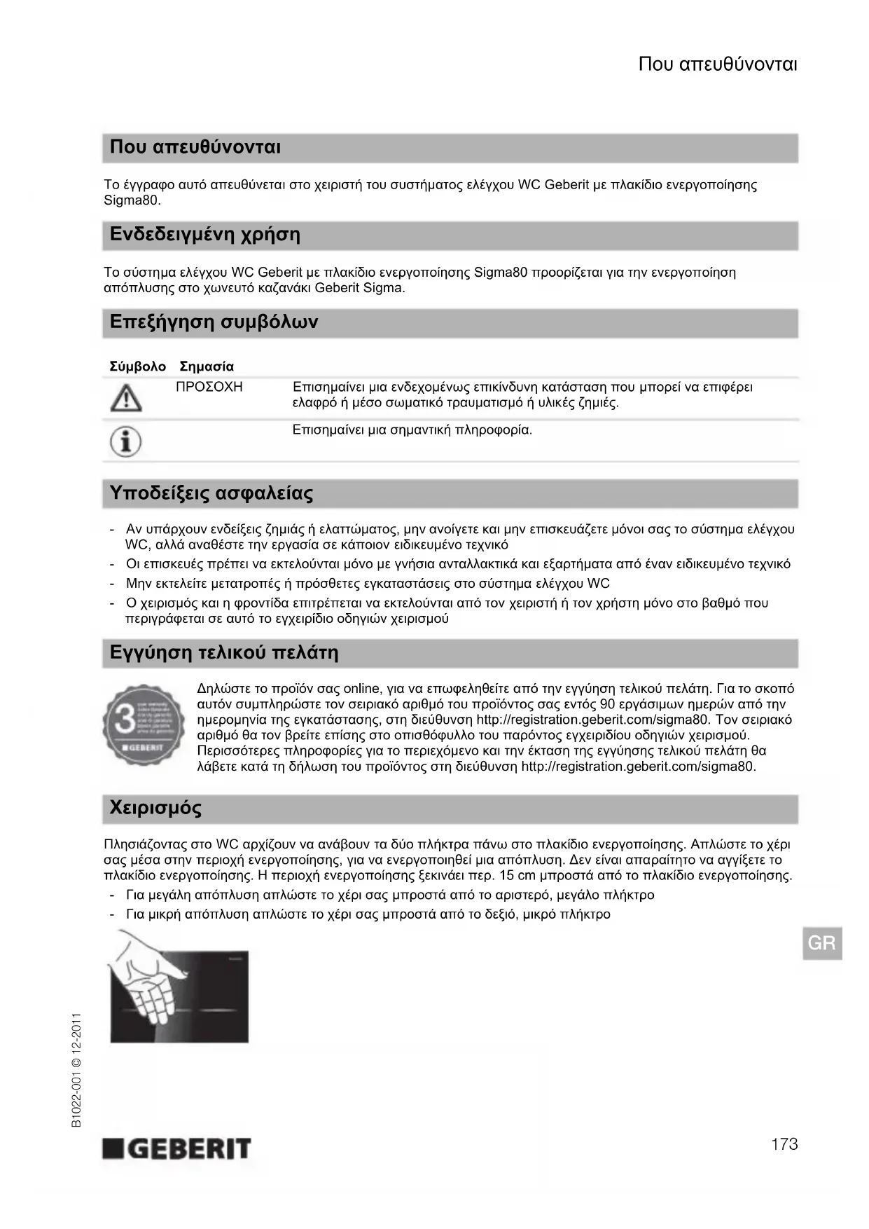 Το έγγραφο αυτό απευθύνεται στο χειριστή του συστήματος ελέγχου WC Geberit με πλακίδιο ενεργοποίησης Sigma80. Το σύστημα ελέγχου WC Geberit με πλακίδιο ενεργοποίησης Sigma80 προορίζεται για την ενεργοποίηση απόπλυσης στο χωνευτό καζανάκι Geberit Sigma. - Αν υπάρχουν ενδείξεις ζημιάς ή ελαττώματος, μην ανοίγετε και μην επισκευάζετε μόνοι σας το σύστημα ελέγχου WC, αλλά αναθέστε την εργασία σε κάποιον ειδικευμένο τεχνικό - Οι επισκευές πρέπει να εκτελούνται μόνο με γνήσια ανταλλακτικά και εξαρτήματα από έναν ειδικευμένο τεχνικό - Μην εκτελείτε μετατροπές ή πρόσθετες εγκαταστάσεις στο σύστημα ελέγχου WC - Ο χειρισμός και η φροντίδα επιτρέπεται να εκτελούνται από τον χειριστή ή τον χρήστη μόνο στο βαθμό που περιγράφεται σε αυτό το εγχειρίδιο οδηγιών χειρισμού Δηλώστε το προϊόν σας online, για να επωφεληθείτε από την εγγύηση τελικού πελάτη. Για το σκοπό αυτόν συμπληρώστε τον σειριακό αριθμό του προϊόντος σας εντός 90 εργάσιμων ημερών από την ημερομηνία της εγκατάστασης, στη διεύθυνση http://registration.geberit.com/sigma80. Τον σειριακό αριθμό θα τον βρείτε επίσης στο οπισθόφυλλο του παρόντος εγχειριδίου οδηγιών χειρισμού. Περισσότερες πληροφορίες για το περιεχόμενο και την έκταση της εγγύησης τελικού πελάτη θα λάβετε κατά τη δήλωση του προϊόντος στη διεύθυνση http://registration.geberit.com/sigma80. Πλησιάζοντας στο WC αρχίζουν να ανάβουν τα δύο πλήκτρα πάνω στο πλακίδιο ενεργοποίησης. Απλώστε το χέρι σας μέσα στην περιοχή ενεργοποίησης, για να ενεργοποιηθεί μια απόπλυση. Δεν είναι απαραίτητο να αγγίξετε το πλακίδιο ενεργοποίησης. Η περιοχή ενεργοποίησης ξεκινάει περ. 15 cm μπροστά από το πλακίδιο ενεργοποίησης. - Για μεγάλη απόπλυση απλώστε το χέρι σας μπροστά από το αριστερό, μεγάλο πλήκτρο - Για μικρή απόπλυση απλώστε το χέρι σας μπροστά από το δεξιό, μικρό πλήκτρο Που απευθύνονται Ενδεδειγμένη χρήση Επεξήγηση συμβόλων Σύμβολο Σημασία ΠΡΟΣΟΧΗ Επισημαίνει μια ενδεχομένως επικίνδυνη κατάσταση που μπορεί να επιφέρει ελαφρό ή μέσο σωματικό τραυματισμό ή υλικές ζημιές. Επισημαίνει μια σημαντική πληροφορία. Υποδείξεις ασφαλείας Εγγύηση τελικού πελάτη Χειρισμός174