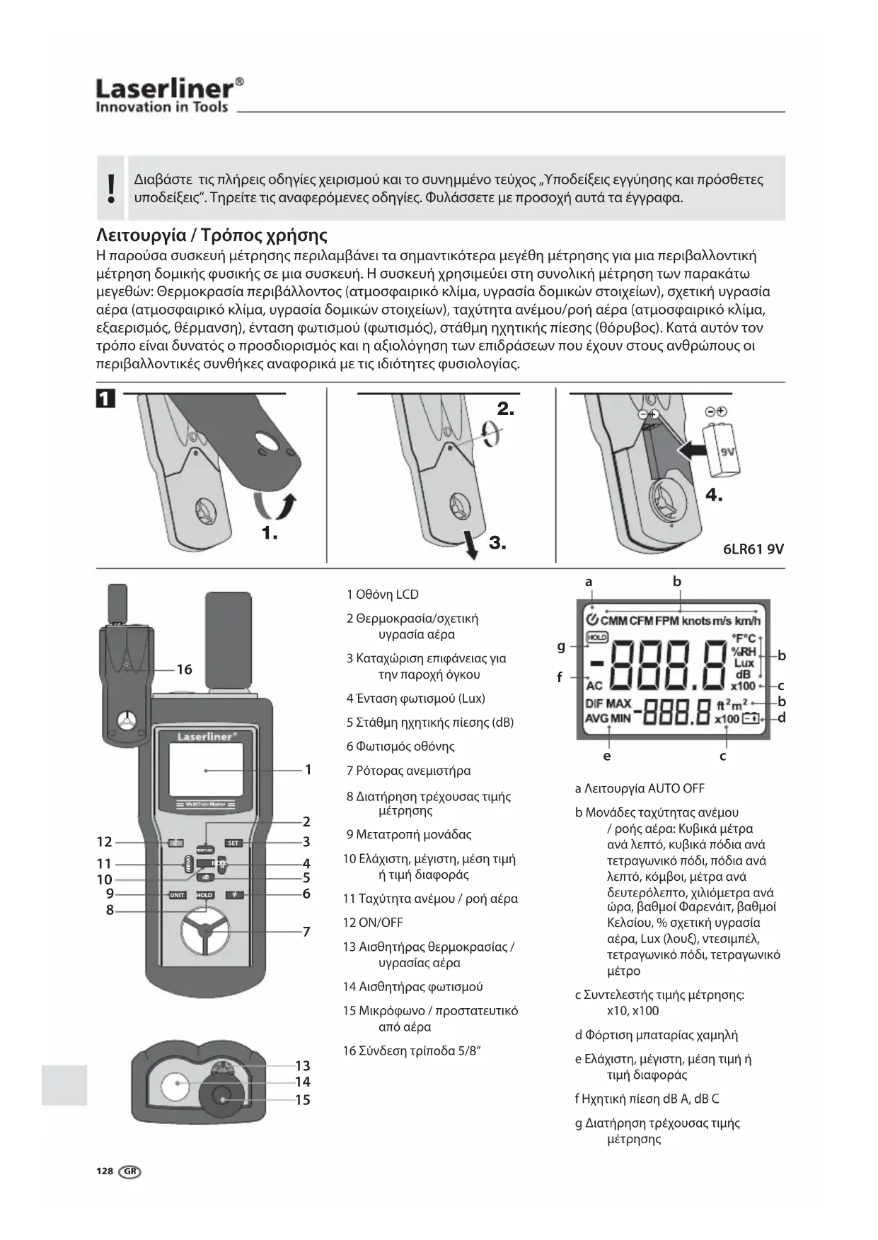 16 Σύνδεση τρίποδα 5/8“ a Λειτουργία AUTO OFF b Μονάδες ταχύτητας ανέμου / ροής αέρα: Κυβικά μέτρα ανά λεπτό, κυβικά πόδια ανά τετραγωνικό πόδι, πόδια ανά λεπτό, κόμβοι, μέτρα ανά δευτερόλεπτο, χιλιόμετρα ανά ώρα, βαθμοί Φαρενάιτ, βαθμοί Κελσίου, % σχετική υγρασία αέρα, Lux (λουξ), ντεσιμπέλ, τετραγωνικό πόδι, τετραγωνικό