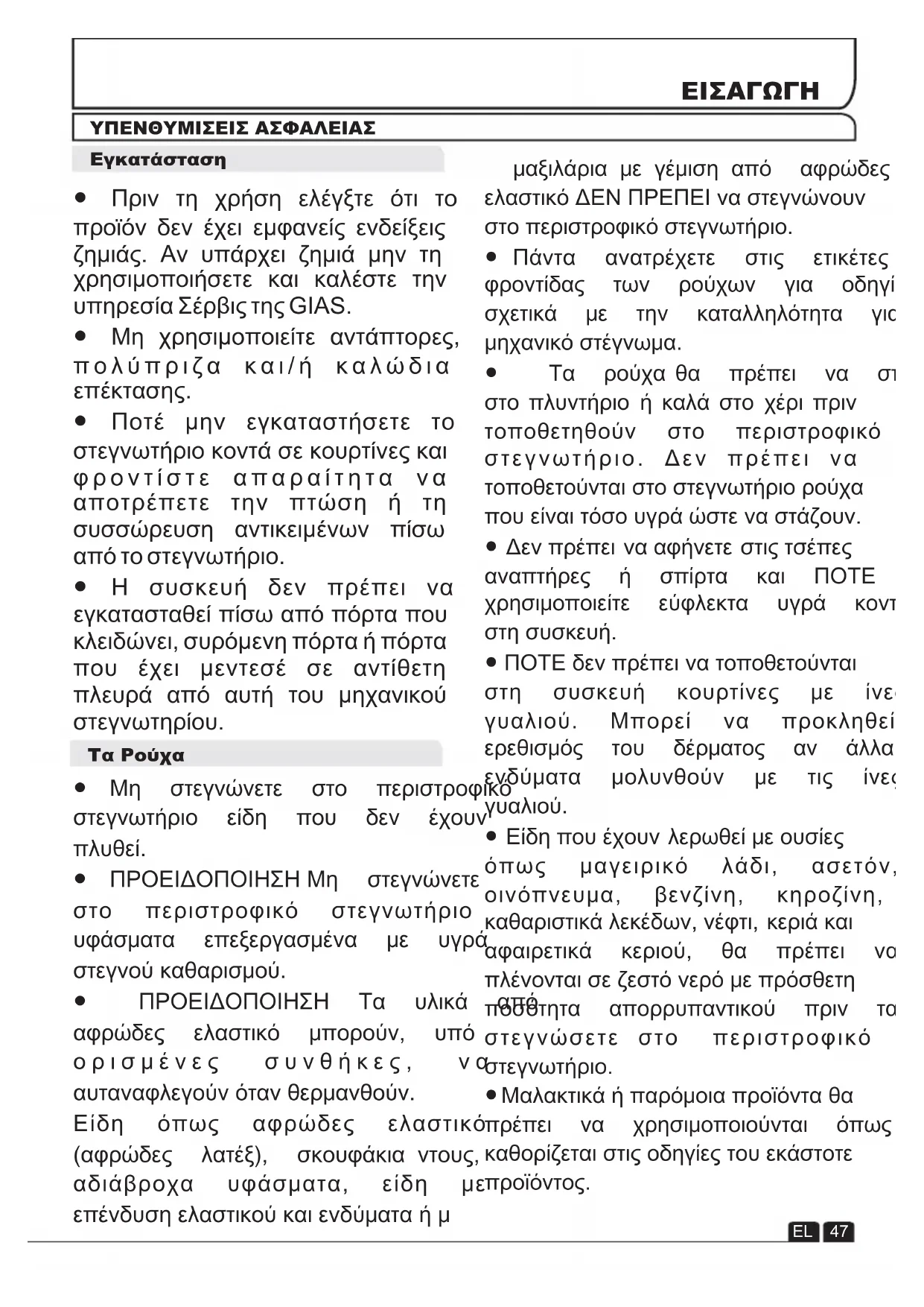 Λειτουργία Καθυστέρηση έναρξης Ακύρωση και επαναφορά του προγράμματος Καθαρισμός και προγραμματισμένη συντήρηση Καθαρισμός του στεγνωτηρίου Τεχνικές προδιαγραφές Αντιμετώπιση προβλημάτων Εξυπηρέτηση πελατών Ανταλλακτικά Υπηρεσία Σέρβις της Gias ΠΕΡΙΕΧΟΜΕΝΑ