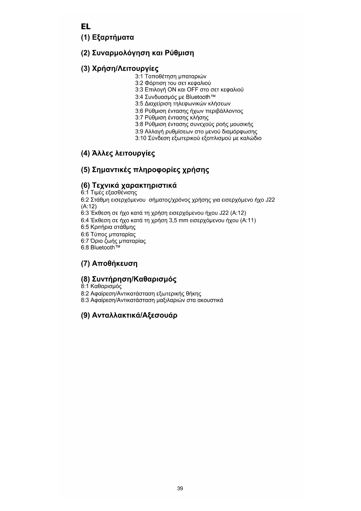 (1) Εξαρτήματα (2) Συναρμολόγηση και Ρύθμιση (3) Χρήση/Λειτουργίες 3:1 Τοποθέτηση μπαταριών 3:2 Φόρτιση του σετ κεφαλιού 3:3 Επιλογή ΟΝ και OFF στο σετ κεφαλιού 3:4 Συνδυασμός με Bluetooth™ 3:5 Διαχείριση τηλεφωνικών κλήσεων 3:6 Ρύθμιση έντασης ήχων περιβάλλοντος 3:7 Ρύθμιση έντασης κλήσης 3:8 Ρύθμιση έντασης συνεχούς ροής μουσικής 3:9 Αλλαγή ρυθμίσεων στο μενού διαμόρφωσης 3:10 Σύνδεση εξωτερικού εξοπλισμού με καλώδιο (4) Άλλες λειτουργίες (5) Σημαντικές πληροφορίες χρήσης (6) Τεχνικά χαρακτηριστικά 6:1 Τιμές εξασθένισης 6:2 Στάθμη εισερχόμενου σήματος/χρόνος χρήσης για εισερχόμενο ήχο J22 (A:12) 6:3 Έκθεση σε ήχο κατά τη χρήση εισερχόμενου ήχου J22 (A:12) 6:4 Έκθεση σε ήχο κατά τη χρήση 3,5 mm εισερχόμενου ήχου (A:11) 6:5 Κριτήρια στάθμης 6:6 Τύπος μπαταρίας 6:7 Όριο ζωής μπαταρίας 6:8 Bluetooth™ (7) Αποθήκευση (8) Συντήρηση/Καθαρισμός 8:1 Καθαρισμός 8:2 Αφαίρεση/Αντικατάσταση εξωτερικής θήκης 8:3 Αφαίρεση/Αντικατάσταση μαξιλαριών στα ακουστικά (9) Ανταλλακτικά/Αξεσουάρ40
