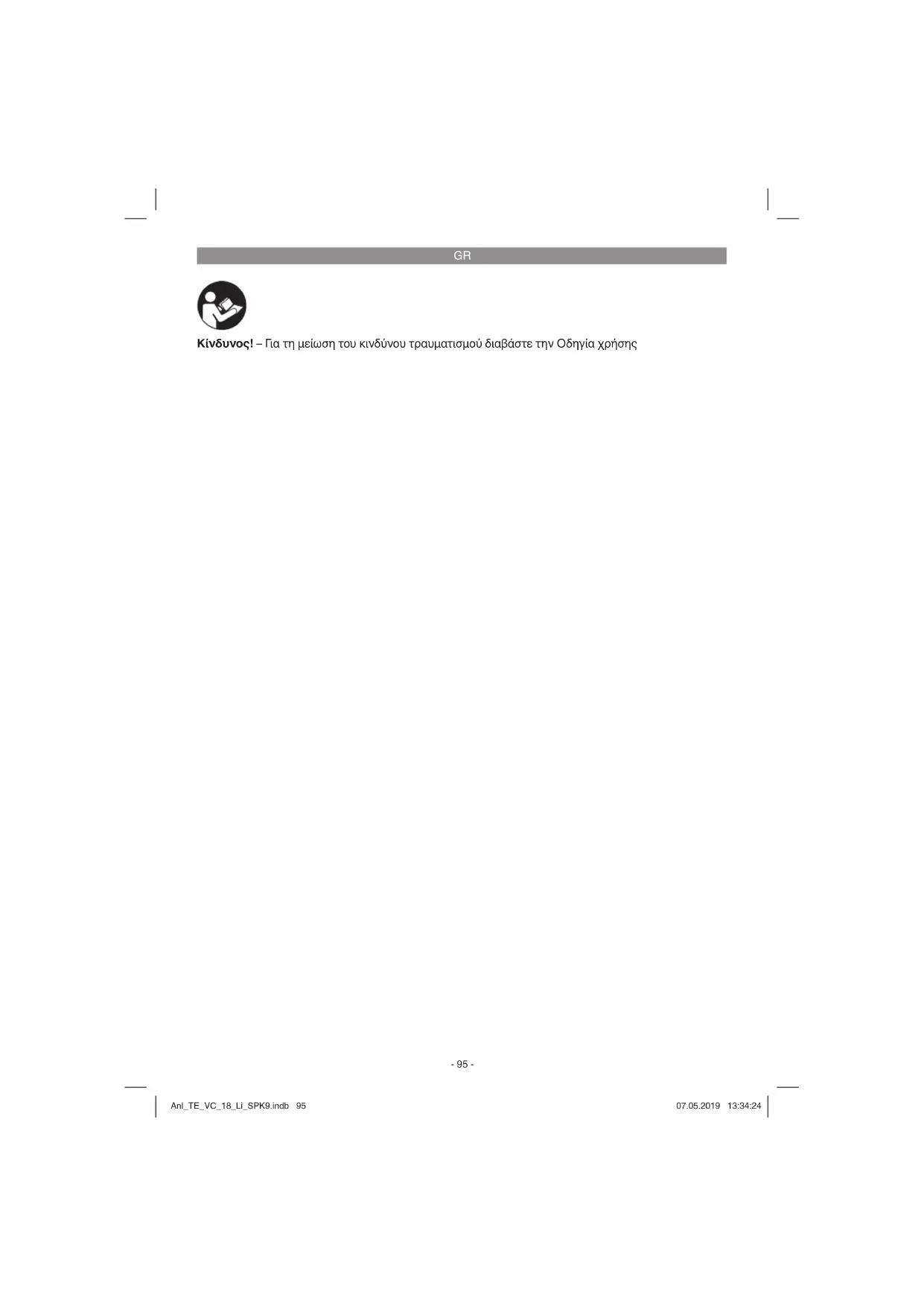 Κίνδυνος! – Για τη μείωση του κινδύνου τραυματισμού διαβάστε την Οδηγία χρήσης Anl_TE_VC_18_Li_SPK9.indb 95Anl_TE_VC_18_Li_SPK9.indb 95 07.05.2019 13:34:2407.05.2019 13:34:24GR