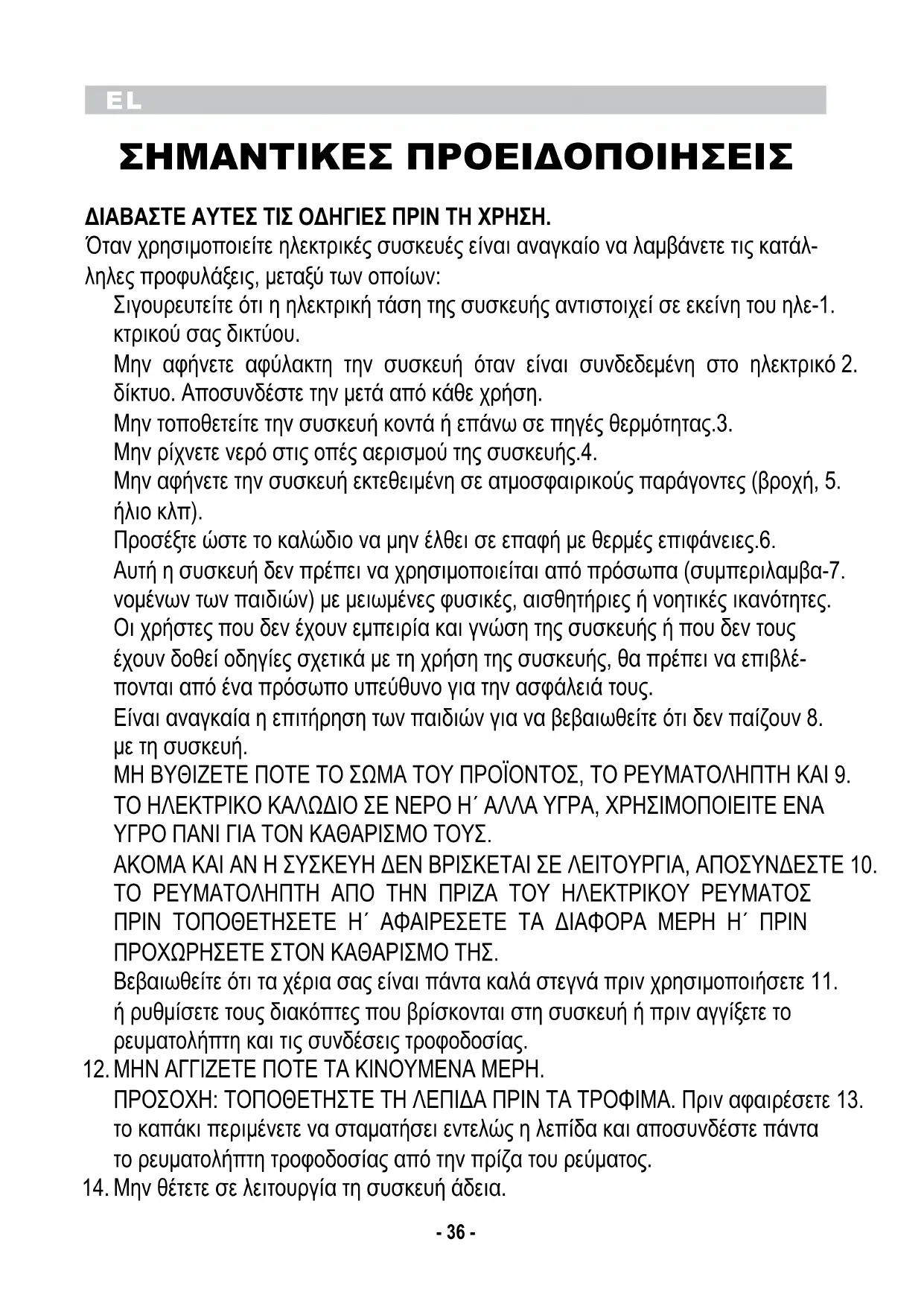 Προσέξτε ώστε το καλώδιο να μην έλθει σε επαφή με θερμές επιφάνειες.6. Αυτή η συσκευή δεν πρέπει να χρησιμοποιείται από πρόσωπα (συμπεριλαμβα-7. νομένων των παιδιών) με μειωμένες φυσικές, αισθητήριες ή νοητικές ικανότητες. Οι χρήστες που δεν έχουν εμπειρία και γνώση της συσκευής ή που δεν τους έχουν δοθεί οδηγίες σχετικά με τη χρήση της συσκευής, θα πρέπει να επιβλέ- πονται από ένα πρόσωπο υπεύθυνο για την ασφάλειά τους. Είναι αναγκαία η επιτήρηση των παιδιών για να βεβαιωθείτε ότι δεν παίζουν 8. με τη συσκευή. ΜΗ ΒΥΘΙΖΕΤΕ ΠΟΤΕ ΤΟ ΣΩΜΑ ΤΟΥ ΠΡΟΪΟΝΤΟΣ, ΤΟ ΡΕΥΜΑΤΟΛΗΠΤΗ ΚΑΙ 9. ΤΟ ΗΛΕΚΤΡΙΚΟ ΚΑΛΩΔΙΟ ΣΕ ΝΕΡΟ Η΄ ΑΛΛΑ ΥΓΡΑ, ΧΡΗΣΙΜΟΠΟΙΕΙΤΕ ΕΝΑ ΥΓΡΟ ΠΑΝΙ ΓΙΑ ΤΟΝ ΚΑΘΑΡΙΣΜΟ ΤΟΥΣ. ΑΚΟΜΑ ΚΑΙ ΑΝ Η ΣΥΣΚΕΥΗ ΔΕΝ ΒΡΙΣΚΕΤΑΙ ΣΕ ΛΕΙΤΟΥΡΓΙΑ, ΑΠΟΣΥΝΔΕΣΤΕ 10. ΤΟ ΡΕΥΜΑΤΟΛΗΠΤΗ ΑΠΟ ΤΗΝ ΠΡΙΖΑ ΤΟΥ ΗΛΕΚΤΡΙΚΟΥ ΡΕΥΜΑΤΟΣ ΠΡΙΝ ΤΟΠΟΘΕΤΗΣΕΤΕ Η΄ ΑΦΑΙΡΕΣΕΤΕ ΤΑ ΔΙΑΦΟΡΑ ΜΕΡΗ Η΄ ΠΡΙΝ ΠΡΟΧΩΡΗΣΕΤΕ ΣΤΟΝ ΚΑΘΑΡΙΣΜΟ ΤΗΣ. Βεβαιωθείτε ότι τα χέρια σας είναι πάντα καλά στεγνά πριν χρησιμοποιήσετε 11. ή ρυθμίσετε τους διακόπτες που βρίσκονται στη συσκευή ή πριν αγγίξετε το ρευματολήπτη και τις συνδέσεις τροφοδοσίας. ΜΗΝ ΑΓΓΙΖΕΤΕ ΠΟΤΕ ΤΑ ΚΙΝΟΥΜΕΝΑ ΜΕΡΗ.12. ΠΡΟΣΟΧΗ: ΤΟΠΟΘΕΤΗΣΤΕ ΤΗ ΛΕΠΙΔΑ ΠΡΙΝ ΤΑ ΤΡΟΦΙΜΑ. Πριν αφαιρέσετε 13. το καπάκι περιμένετε να σταματήσει εντελώς η λεπίδα και αποσυνδέστε πάντα το ρευματολήπτη τροφοδοσίας από την πρίζα του ρεύματος. Μην θέτετε σε λειτουργία τη συσκευή άδεια.14.EL