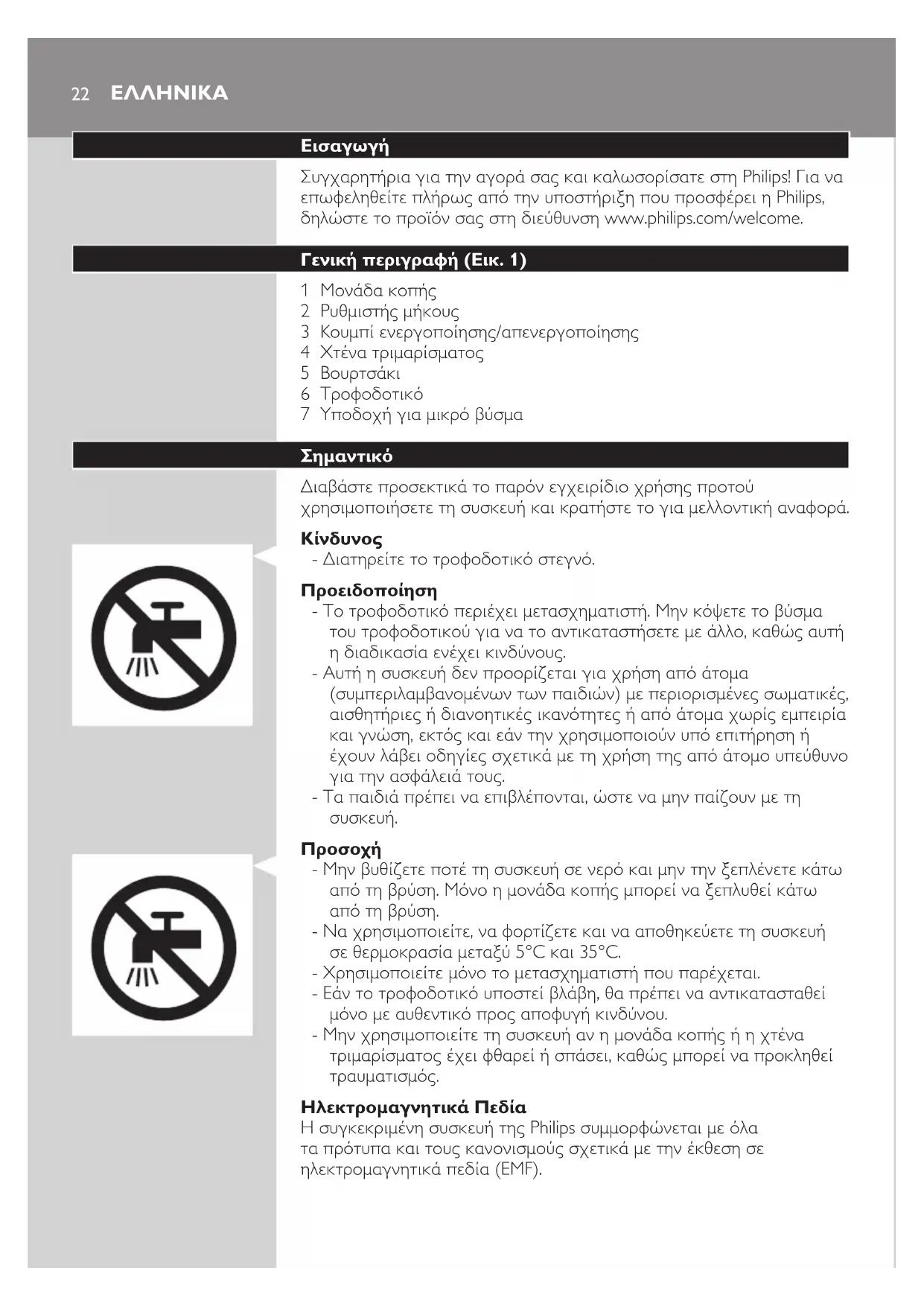 Η συγκεκριμένη συσκευή της Philips συμμορφώνεται με όλα τα πρότυπα και τους κανονισμούς σχετικά με την έκθεση σε ηλεκτρομαγνητικά πεδία (EMF).