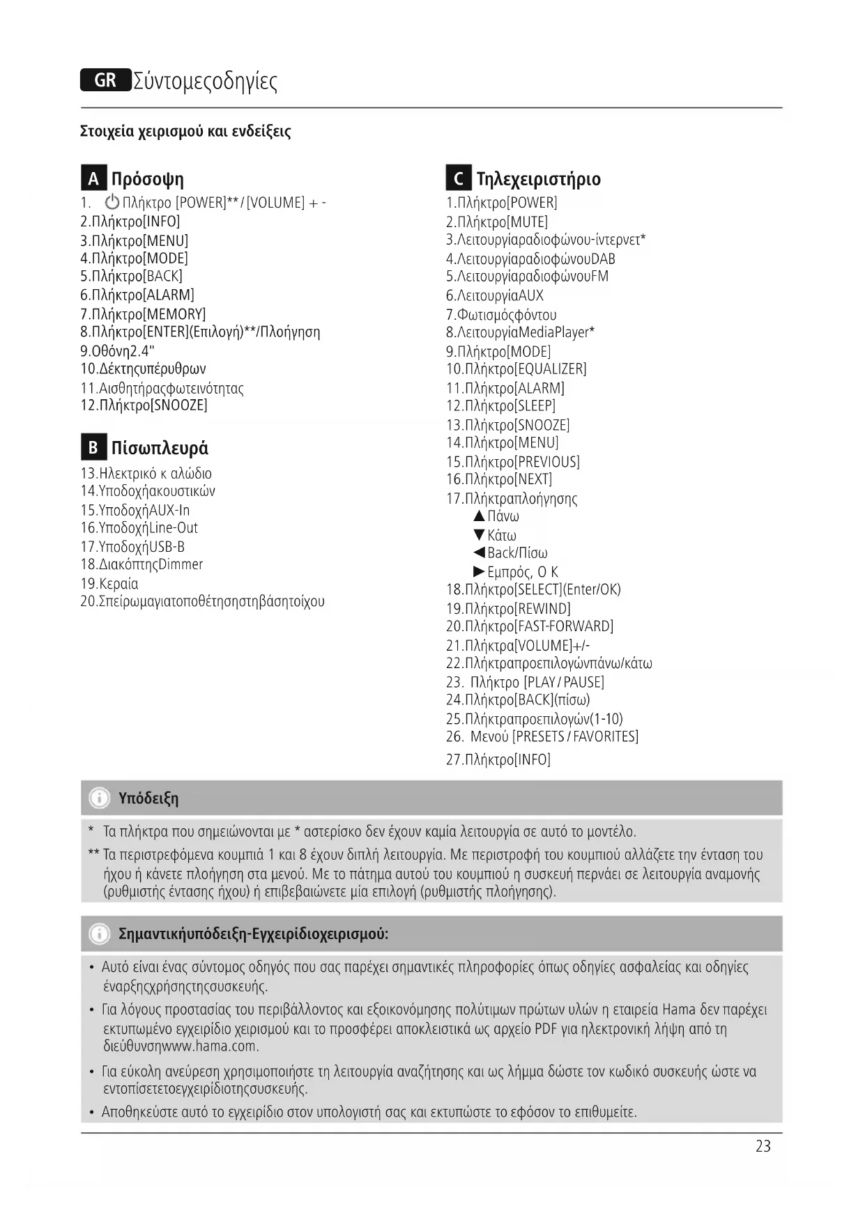 - Γιαλόγους προστασίας τουπεριβάλλοντος καιεξοικονόμησης πολύτιμων πρώτων υλών ηεταιρεία Hama δεν παρέχει εκτυπωμένοεγχειρίδιο χειρισμού καιτοπροσφέρει αποκλειστικάωςαρχείο PDF για ηλεκτρονική λήψη από τη διεύθυνση www.hama.com.
