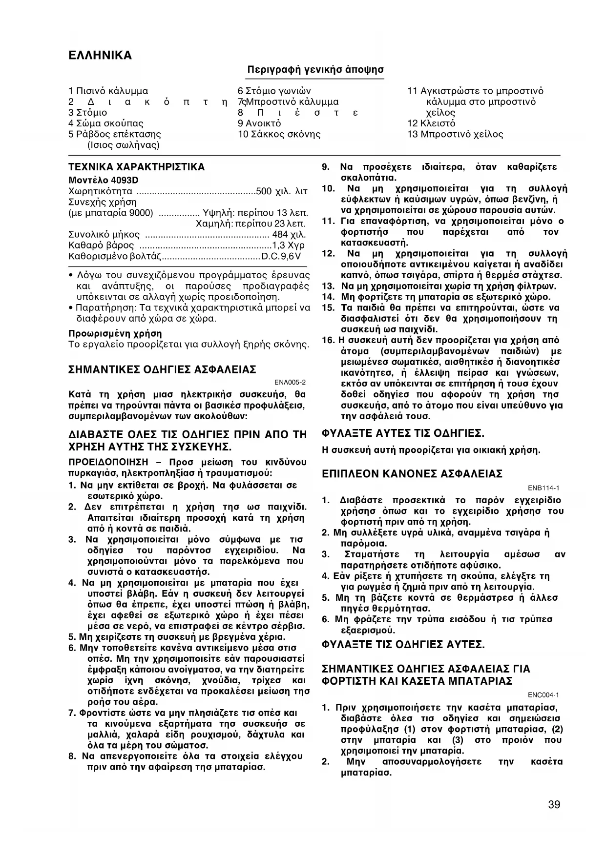 Μνο για χώρες ΕΕ Μην απορρίπτετε ηλεκτρικ εξοπλισµ ή µπαταρίες µαζί µε τα οικιακά απβλητα! Σύµφωνα µε την Ευρωπαϊκή Οδηγία 2002/96/ΕΚ περί αποβλήτων ειδών ηλεκτρικού και ηλεκτρονικού εξοπλισµού και την Οδηγία 2006/66/EΚ περί µπαταριών και συσσωρευτών και αποβλήτων µπαταριών και συσσωρευτών και την εφαρµογή τους σύµφωνα µε την εθνική νοµοθεσία, απαιτείται συλλογή του ηλεκτρικού εξοπλισµού και των µπαταριών, το ριο ζωής των οποίων έχει λήξει, ξεχωριστά και επιστροφή τους σε εγκατάσταση ανακύκλωσης συµβατή µε την προστασία του περιβάλλοντος.6 ENGLISH Explanation of general view 1Rear cover 2 Switch 3 Nozzle 4 Cleaner body 5 Extension wand (Straight pipe) 6 Corner nozzle 7 Front cover 8 Depress 9 Open 10 Dust bag 11 Hook front cover onto front lip 12 Close 13 Front lip SPECIFICATIONS Model 4093D Capacity ................................................................500 ml Continuous use (with battery 9000) .........................High: Approx.13min. Low: Approx. 23 min. Overall length ......................................................484 mm Net weight ..............................................................1.3kg Rated voltage ...................................................D.C.9.6V