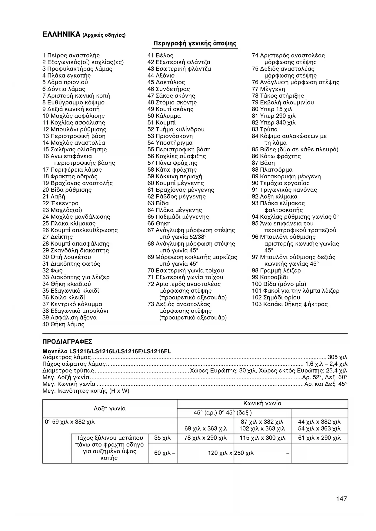 85 Βίδες (δύο σε κάθε πλευρά) 86 Κάτω φράχτης 87 Βάση 88 Πλατφρμα 89 Κατακρυφη μέγγενη 90 Τεμάχιο εργασίας 91 Τριγωνικς καννας 92 Λοξή κλίμακα 93 Πλάκα κλίμακας φαλτσοκοπής 94 Κοχλίας ρύθμισης γωνίας 0° 95 Άνω επιφάνεια του περιστροφικού τραπεζιού 96 Μπουλνι ρύθμισης αριστερής κωνικής γωνίας 45° 97 Μπουλνι ρύθμισης δεξιάς κωνικής γωνίας 45° 98 Γραμμή λέιζερ 99 Κατσαβίδι 100 Βίδα (μνο μία) 101 Φακοί για την λάμπα λέιζερ 102 Σημάδι ορίου 103 Καπάκι θήκης ψήκτρας ΠΡΟΔΙΑΓΡΑΦΕΣ Μοντέλο LS1216/LS1216L/LS1216F/LS1216FL Διάμετρος λάμας................................................................................................................................................ 305 χιλ Πάχος σώματος λάμας......................................................................................................................... 1,6 χιλ – 2,4 χιλ Διάμετρος τρύπας..........................................................Χώρες Ευρώπης: 30 χιλ, Χώρες εκτς Ευρώπης: 25,4 χιλ Μεγ. Λοξή γωνία..................................................................................................................................Αρ. 52°, Δεξ. 60° Μεγ. Κωνική γωνία ...............................................................................................................................Aρ. και Δεξ. 45° Μεγ. Ικαντητες κοπής (H x W)
