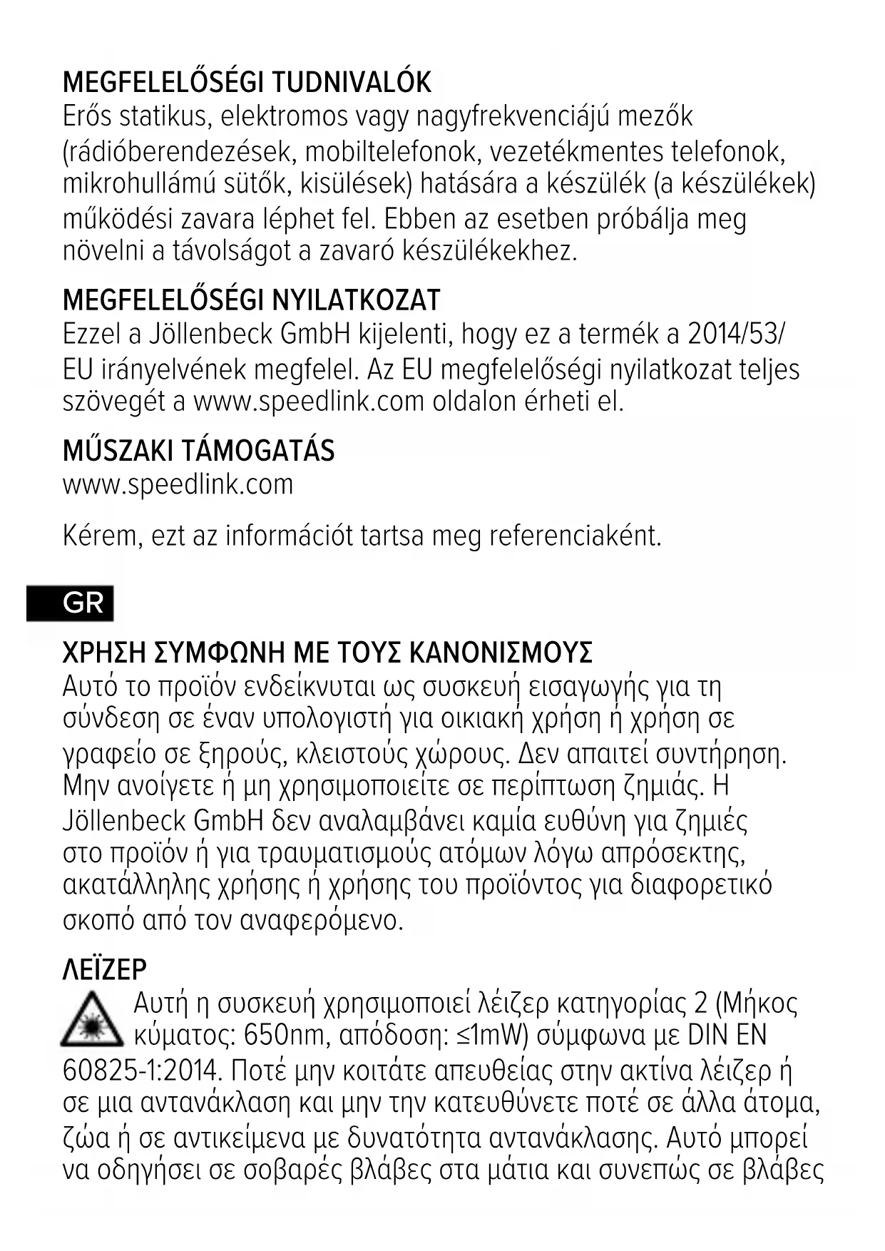 Διά της παρούσης δηλώνει η Jöllenbeck GmbH, ότι αυτό το προϊόν αντιστοιχεί στην κατευθυντήρια οδηγία 2014/53/EU. Μπορείτε να αναζητήσετε το πλήρες κείμενο της Δήλωσης Συμμόρφωσης ΕΕ στην ιστοσελίδα www.speedlink.com.