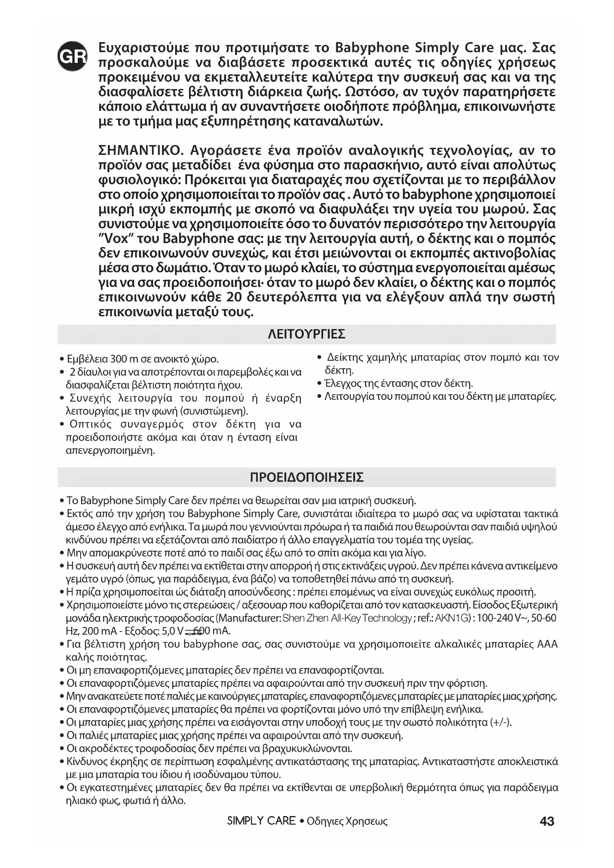 ŘΕμβέλεια 300 m σε ανοικτό χώρο.Ř2 δίαυλοι για να αποτρέπονται οι παρεμβολές και να διασφαλίζεται βέλτιστη ποιότητα ήχου. ŘΣυνεχής λειτουργία του πομπού ή έναρξη λειτουργίας με την φωνή (συνιστώμενη). ŘΟπτικός συναγερμός στον δέκτη για να προειδοποιήστε ακόμα και όταν η ένταση είναι απενεργοποιημένη. ŘΔείκτης χαμηλής μπαταρίας στον πομπό και τον ŘΈλεγχος της έντασης στον δέκτη.ŘΛειτουργία του πομπού και του δέκτη με μπαταρίες. ΛΕΙΤΟΥΡΓΙΕΣ Ř Το Babyphone Simply Care δεν πρέπει να θεωρείται σαν μια ιατρική συσκευή. Ř Εκτός από την χρήση του Babyphone Simply Care, συνιστάται ιδιαίτερα το μωρό σας να υφίσταται τακτικά άμεσο έλεγχο από ενήλικα. Τα μωρά που γεννιούνται πρόωρα ή τα παιδιά που θεωρούνται σαν παιδιά υψηλού κινδύνου πρέπει να εξετάζονται από παιδίατρο ή άλλο επαγγελματία του τομέα της υγείας. Ř Μην απομακρύνεστε ποτέ από το παιδί σας έξω από το σπίτι ακόμα και για λίγο. Ř Η συσκευή αυτή δεν πρέπει να εκτίθεται στην απορροή ή στις εκτινάξεις υγρού. Δεν πρέπει κάνενα αντικείμενο γεμάτο υγρό (όπως, για παράδειγμα, ένα βάζο) να τοποθετηθεί πάνω από τη συσκευή. Ř Η πρίζα χρησιμοποείται ώς διάταξη αποσύνδεσης : πρέπει επομένως να είναι συνεχώς ευκόλως προσιτή. Ř Χρησιμοποιείστε μόνο τις στερεώσεις / αξεσουαρ που καθορίζεται από τον κατασκευαστή. Είσοδος Εξωτερική μονάδα ηλεκτρικής τροφοδοσίας (Manufacturer: 6KHQ=KHQ$OO.H\7HFKQRORJ\ ; ref.: AKN1G) : 100-240 V~, 50-60 Hz, 200 mA - Εξοδος: 5,0 V , 600 mA. Ř Για βέλτιστη χρήση του babyphone σας, σας συνιστούμε να χρησιμοποιείτε αλκαλικές μπαταρίες AAA καλής ποιότητας. Ř Οι μη επαναφορτιζόμενες μπαταρίες δεν πρέπει να επαναφορτίζονται. Ř Οι επαναφορτιζόμενες μπαταρίες πρέπει να αφαιρούνται από την συσκευή πριν την φόρτιση. Ř Μην ανακατεύετε ποτέ παλιές με καινούργιες μπαταρίες, επαναφορτιζόμενες μπαταρίες με μπαταρίες μιας χρήσης. Ř Οι επαναφορτιζόμενες μπαταρίες θα πρέπει να φορτίζονται μόνο υπό την επίβλεψη ενήλικα. Ř Οι μπαταρίες μιας χρήσης πρέπει να εισάγονται στην υποδοχή τους με την σωστό πολικότητα (+/-). Ř Οι παλιές μπαταρίες μιας χρήσης πρέπει να αφαιρούνται από την συσκευή.Ř Οι ακροδέκτες τροφοδοσίας δεν πρέπει να βραχυκυκλώνονται. Ř Κίνδυνος έκρηξης σε περίπτωση εσφαλμένης αντικατάστασης της μπαταρίας. Αντικαταστήστε αποκλειστικά με μια μπαταρία του ίδιου ή ισοδύναμου τύπου. Ř Οι εγκατεστημένες μπαταρίες δεν θα πρέπει να εκτίθενται σε υπερβολική θερμότητα όπως για παράδειγμα ηλιακό φως, φωτιά ή άλλο. ΠΡΟΕΙΔΟΠΟΙΗΣΕΙΣ44 SIMPLY CAREŘΟδηγιες Χρησεως