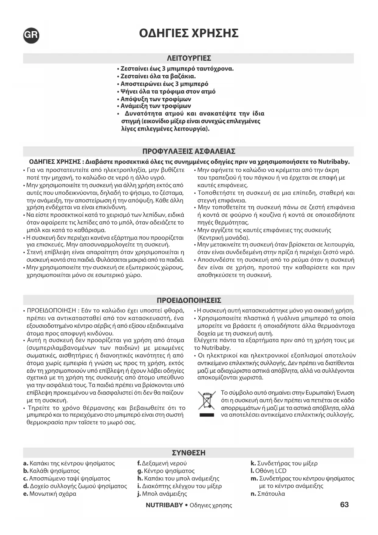 - Οι ηλεκτρικοί και ηλεκτρονικοί εξοπλισμοί αποτελούν αντικείμενο επιλεκτικής συλλογής. Δεν πρέπει να διατίθενται μαζί με αδιαχώριστα αστικά απόβλητα, αλλά να συλλέγονται αποκομίζονται χωριστά. Το σύμβολο αυτό σημαίνει στην Ευρωπαϊκή Ένωση ότι η συσκευή αυτή δεν πρέπει να πετιέται σε κάδο απορριμμάτων ή μαζί με τα αστικά απόβλητα, αλλά να αποτελέσει αντικείμενο επιλεκτικής συλλογής. ΠΡΟΦΥΛΑΞΕΙΣ ΑΣΦΑΛΕΙΑΣ ΟΔΗΓΙΕΣ ΧΡΗΣΗΣ : Διαβάστε προσεκτικά όλες τις συνημμένες οδηγίες πριν να χρησιμοποιήσετε το Nutribaby.