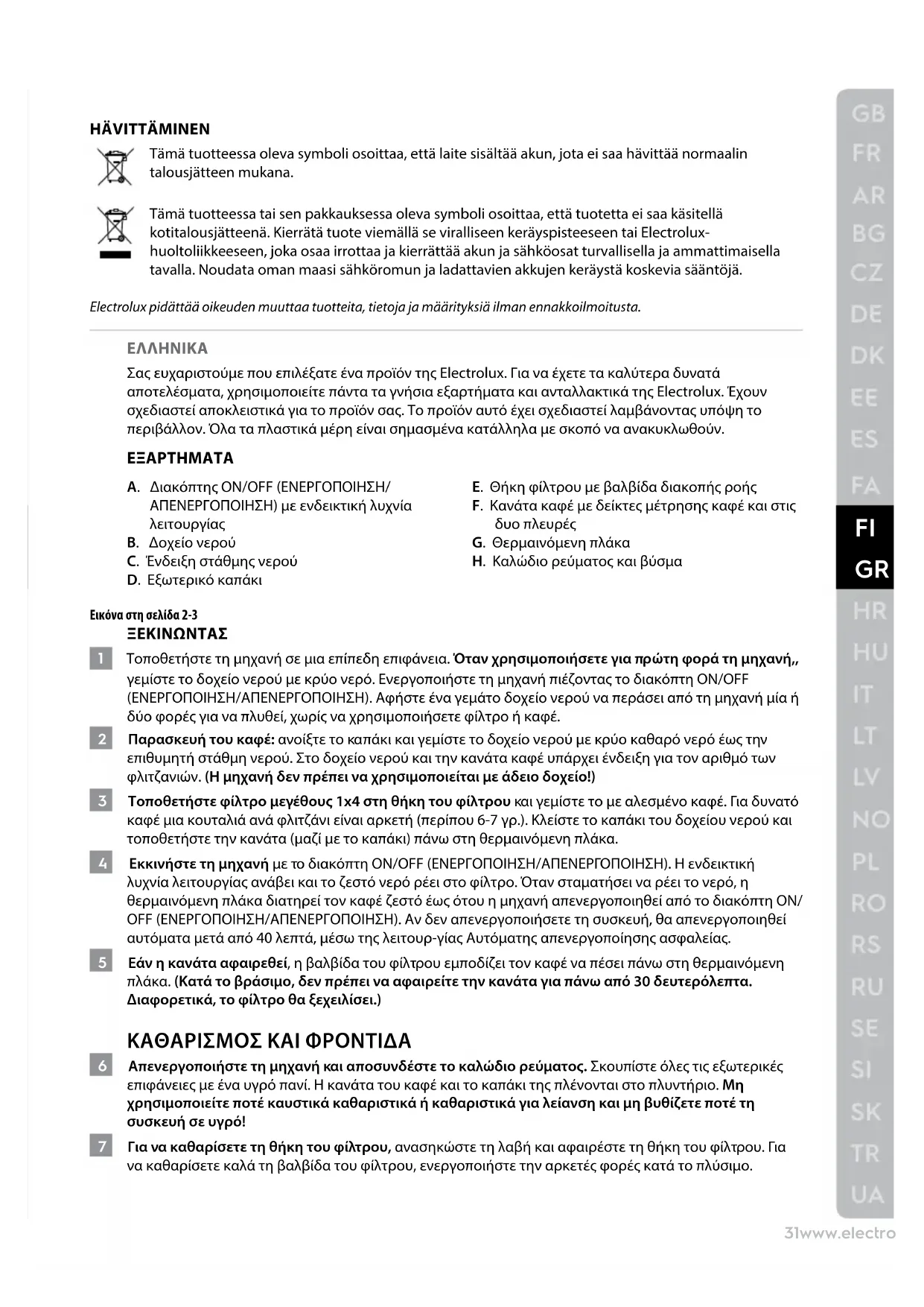 Το παρόν σύμβολο επάνω στη προϊόν υποδεικνύει ότι το συγκεκριμένο προϊόν περιέχει μια μπαταρία η οποία δεν θα πρέπει να απορρίπτεται μαζί με τα συνήθη οικιακά απορρίμματα. Το παρόν σύμβολο επάνω στο προϊόν ή τη συσκευασία του υποδεικνύει ότι το προϊόν δεν θα πρέπει να αντιμετωπίζεται ως οικιακό απόρριμμα. Για να ανακυκλώσετε το προϊόν σας, παρακαλώ μεταφέρετε το σε ένα επίσημο σημείο συλλογής ή στο κέντρο σέρβις της Electrolux που μπορεί να αφαιρέσει και να ανακυκλώσει την μπαταρία και τα ηλεκτρικά μέρη με ασφαλή και επαγγελματικό τρόπο. Τηρήστε τους κανόνες της χώρας σας για την ξεχωριστή συλλογή ηλεκτρικών προϊόντων και επαναφορτιζόμενων μπαταριών. Η εταιρεία Electrolux επιφυλάσσεται του δικαιώματος να αλλάξει τα προϊόντα, τις πληροφορίες και τις προδιαγραφές της χωρίς προηγούμενη ειδοποίηση. HRVATSKI Zahvaljujemo vam što ste odabrali proizvod tvrtke Electrolux. Kako biste uvijek postigli najbolje rezultate, upotrebljavajte isključivo originalni pribor i rezervne dijelove tvrtke Electrolux. Izrađeni suposebno za vaš proizvod. Ovaj proizvod izrađen je tako da nije štetan za okoliš. Svi plastični dijelovi označeni su za recikliranje. SASTAVNI DIJELOVI A. Prekidač za uključivanje/isključivanje sa žaruljicom pokazivača napajanja B. Spremnik za vodu C. Oznaka razine vode D. Poklopac E. Držač ltra s ventilom za sprječavanje kapanja F. Vrč za kavu s oznakama na obje strane G. Ploča za grijanje H. Električni kabel i utikač Slika, stranica 2-3