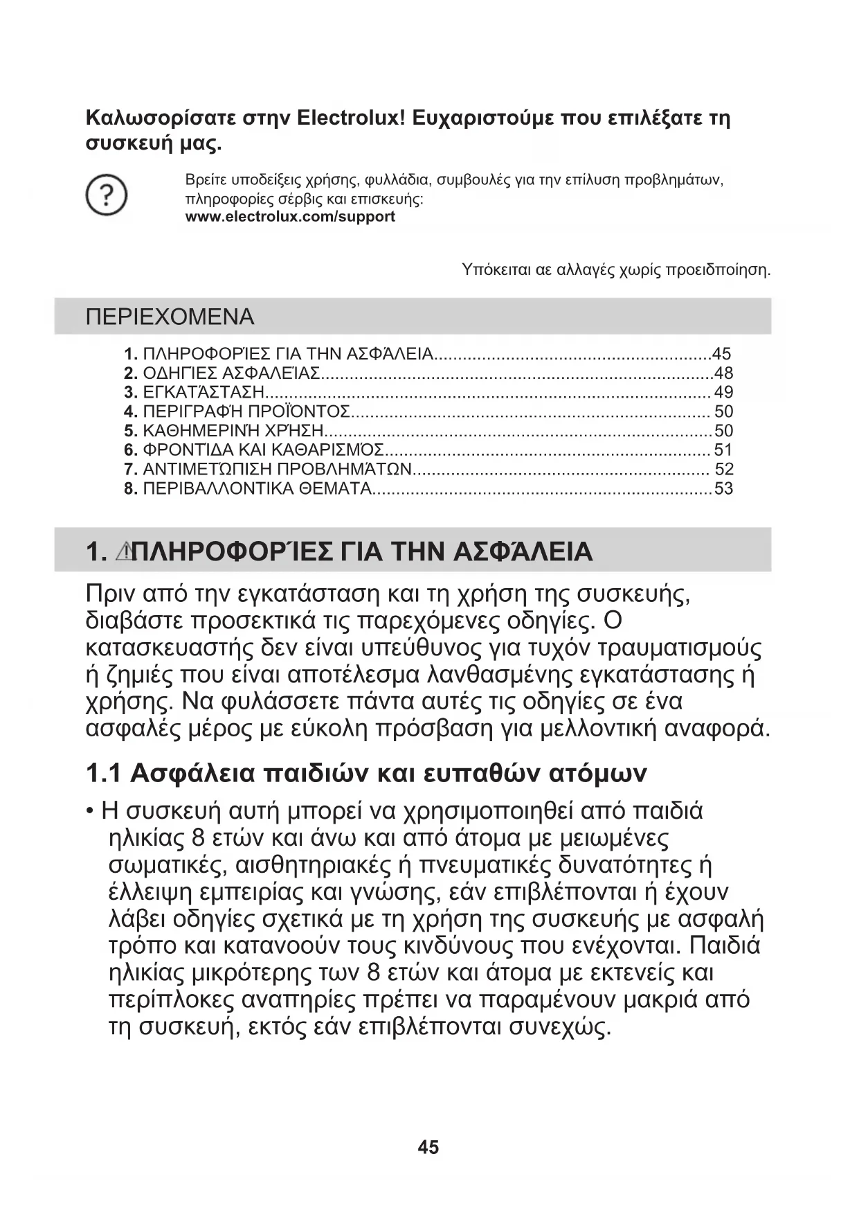 - Η συσκευή αυτή μπορεί να χρησιμοποιηθεί από παιδιά ηλικίας 8 ετών και άνω και από άτομα με μειωμένες σωματικές, αισθητηριακές ή πνευματικές δυνατότητες ή έλλειψη εμπειρίας και γνώσης, εάν επιβλέπονται ή έχουν λάβει οδηγίες σχετικά με τη χρήση της συσκευής με ασφαλή τρόπο και κατανοούν τους κινδύνους που ενέχονται. Παιδιά ηλικίας μικρότερης των 8 ετών και άτομα με εκτενείς και περίπλοκες αναπηρίες πρέπει να παραμένουν μακριά από τη συσκευή, εκτός εάν επιβλέπονται συνεχώς. 45• Τα παιδιά πρέπει να εποπτεύονται ώστε να διασφαλίζεται ότι δεν παίζουν με τη συσκευή.