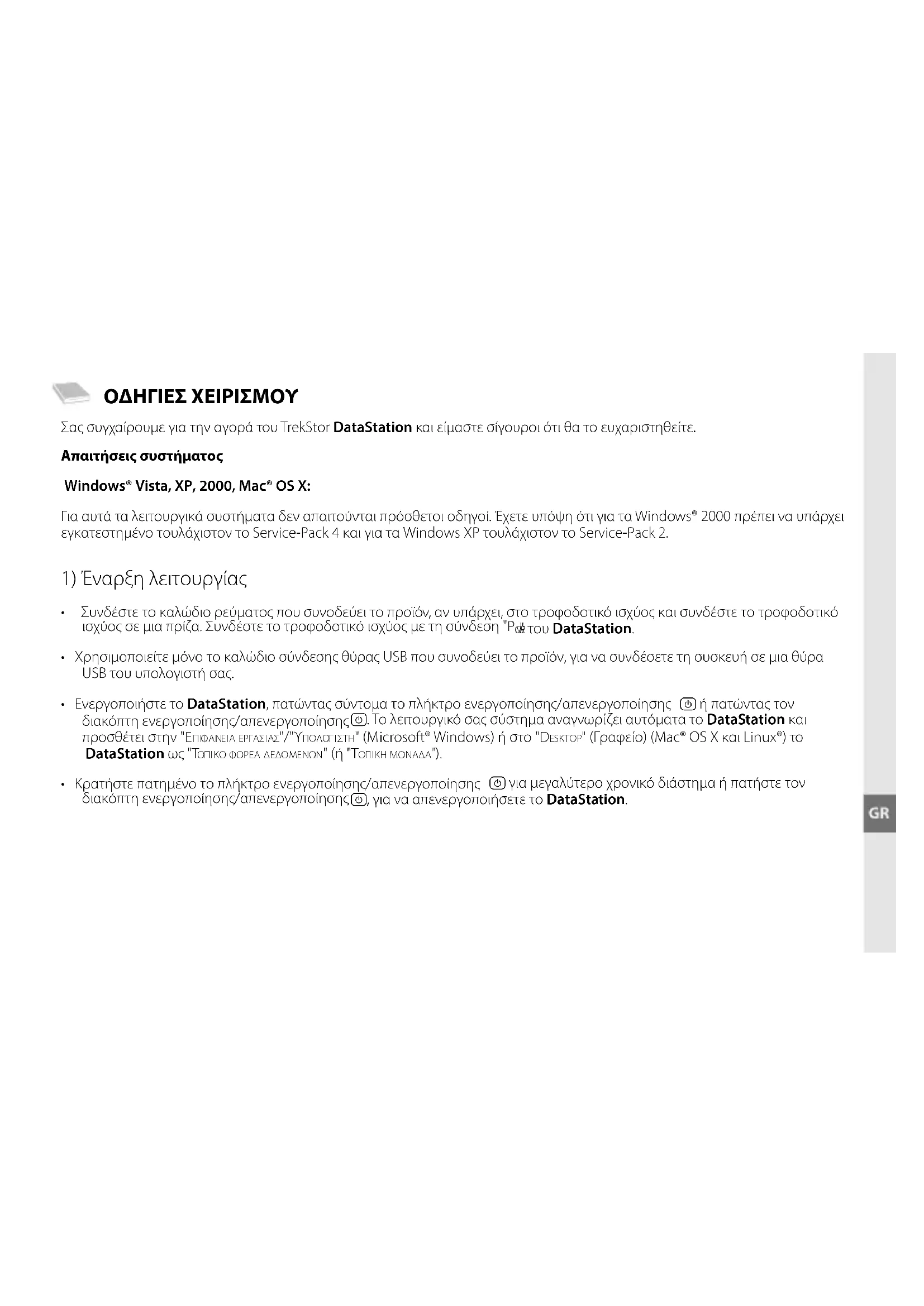 ΟΔΗΓΙΕΣ ΧΕΙΡΙΣΜΟΥ Σας συγχαίρουμε για την αγορά του TrekStor DataStation και είμαστε σίγουροι ότι θα το ευχαριστηθείτε. Απαιτήσεις συστήματος Windows® Vista, XP, 2000, Mac® OS X: Για αυτά τα λειτουργικά συστήματα δεν απαιτούνται πρόσθετοι οδηγοί. Έχετε υπόψη ότι για τα Windows® 2000 πρέπει να υπάρχει εγκατεστημένο τουλάχιστον το Service-Pack 4 και για τα Windows XP τουλάχιστον το Service-Pack 2.
