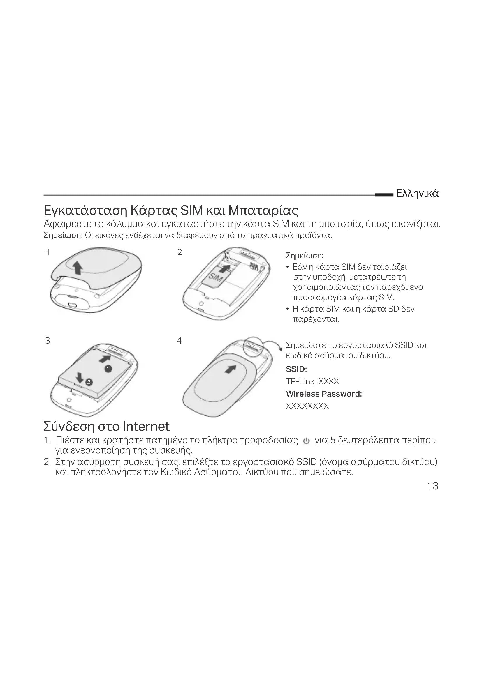 - Η κάρτα SIM και η κάρτα SD δεν παρέχονται. Σημειώστε το εργοστασιακό SSID και κωδικό ασύρματου δικτύου. SSID: TP-Link_XXXX Wireless Password: XXXXXXXX14