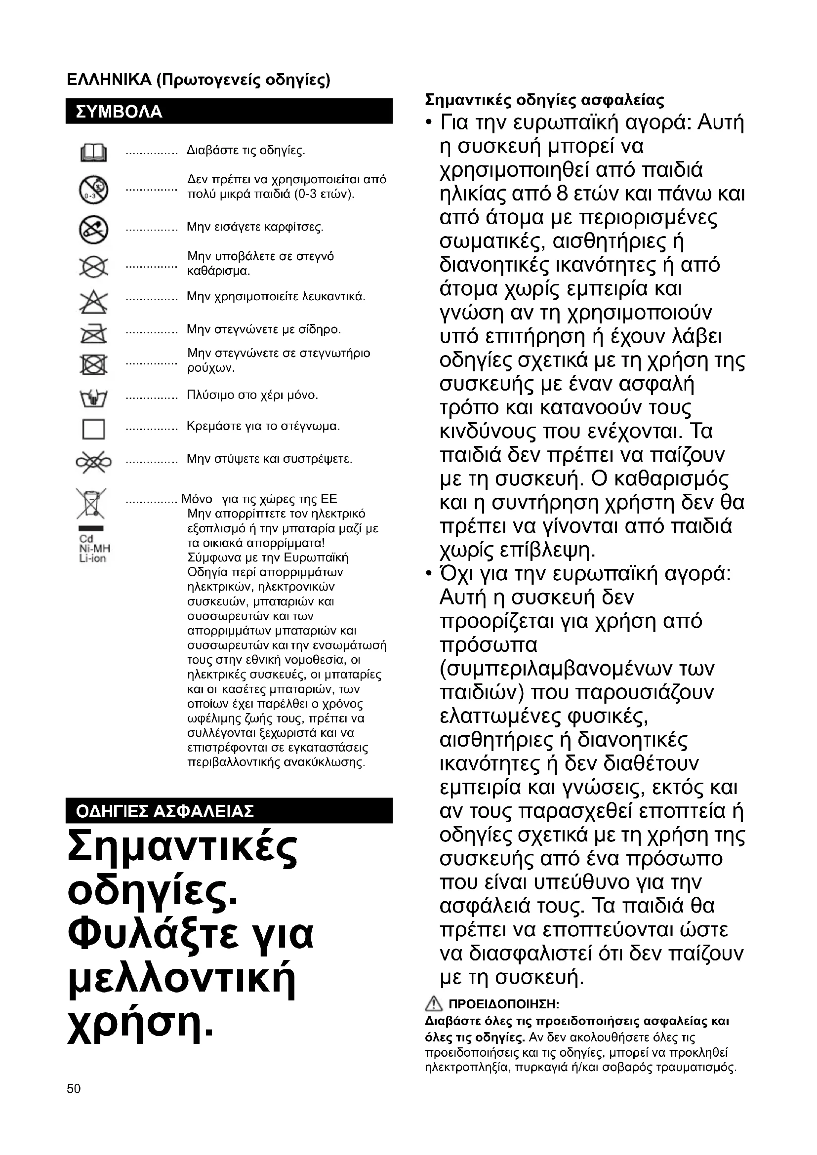 (συμπεριλαμβανομένων των παιδιών) που παρουσιάζουν ελαττωμένες φυσικές, αισθητήριες ή διανοητικές ικανότητες ή δεν διαθέτουν εμπειρία και γνώσεις, εκτός και αν τους παρασχεθεί εποπτεία ή οδηγίες σχετικά με τη χρήση της συσκευής από ένα πρόσωπο που είναι υπεύθυνο για την ασφάλειά τους. Τα παιδιά θα πρέπει να εποπτεύονται ώστε να διασφαλιστεί ότι δεν παίζουν με τη συσκευή. ΠΡΟΕΙ∆ΟΠΟΙΗΣΗ: ∆ιαβάστε όλες τις προειδοποιήσεις ασφαλείας και όλες τις οδηγίες. Αν δεν ακολουθήσετε όλες τις προειδοποιήσεις και τις οδηγίες, μπορεί να προκληθεί ηλεκτροπληξία, πυρκαγιά ή/και σοβαρός τραυματισμός.