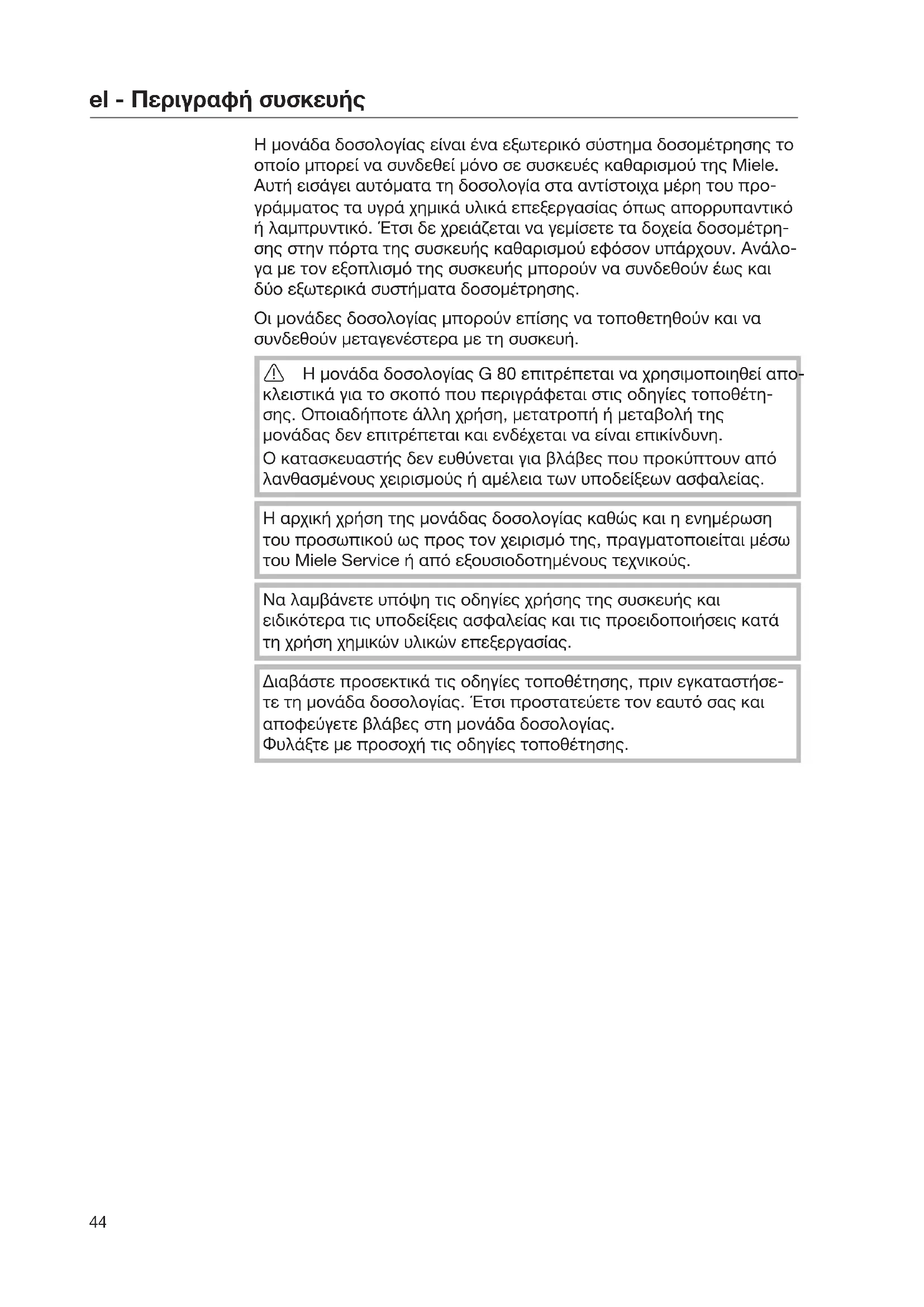 Η μονάδα δοσολογίας είναι ένα εξωτερικό σύστημα δοσομέτρησης το οποίο μπορεί να συνδεθεί μόνο σε συσκευές καθαρισμού της Miele. Αυτή εισάγει αυτόματα τη δοσολογία στα αντίστοιχα μέρη του προ- γράμματος τα υγρά χημικά υλικά επεξεργασίας όπως απορρυπαντικό ή λαμπρυντικό. Έτσι δε χρειάζεται να γεμίσετε τα δοχεία δοσομέτρη- σης στην πόρτα της συσκευής καθαρισμού εφόσον υπάρχουν. Ανάλο- γα με τον εξοπλισμό της συσκευής μπορούν να συνδεθούν έως και δύο εξωτερικά συστήματα δοσομέτρησης. Οι μονάδες δοσολογίας μπορούν επίσης να τοποθετηθούν και να συνδεθούν μεταγενέστερα με τη συσκευή. Η μονάδα δοσολογίας G 80 επιτρέπεται να χρησιμοποιηθεί απο- κλειστικά για το σκοπό που περιγράφεται στις οδηγίες τοποθέτη- σης. Οποιαδήποτε άλλη χρήση, μετατροπή ή μεταβολή της μονάδας δεν επιτρέπεται και ενδέχεται να είναι επικίνδυνη. Ο κατασκευαστής δεν ευθύνεται για βλάβες που προκύπτουν από λανθασμένους χειρισμούς ή αμέλεια των υποδείξεων ασφαλείας. Η αρχική χρήση της μονάδας δοσολογίας καθώς και η ενημέρωση του προσωπικού ως προς τον χειρισμό της, πραγματοποιείται μέσω του Miele Service ή από εξουσιοδοτημένους τεχνικούς. Να λαμβάνετε υπόψη τις οδηγίες χρήσης της συσκευής και ειδικότερα τις υποδείξεις ασφαλείας και τις προειδοποιήσεις κατά τη χρήση χημικών υλικών επεξεργασίας. Διαβάστε προσεκτικά τις οδηγίες τοποθέτησης, πριν εγκαταστήσε- τε τη μονάδα δοσολογίας. Έτσι προστατεύετε τον εαυτό σας και αποφεύγετε βλάβες στη μονάδα δοσολογίας. Φυλάξτε με προσοχή τις οδηγίες τοποθέτησης.el - Περιγραφή συσκευής