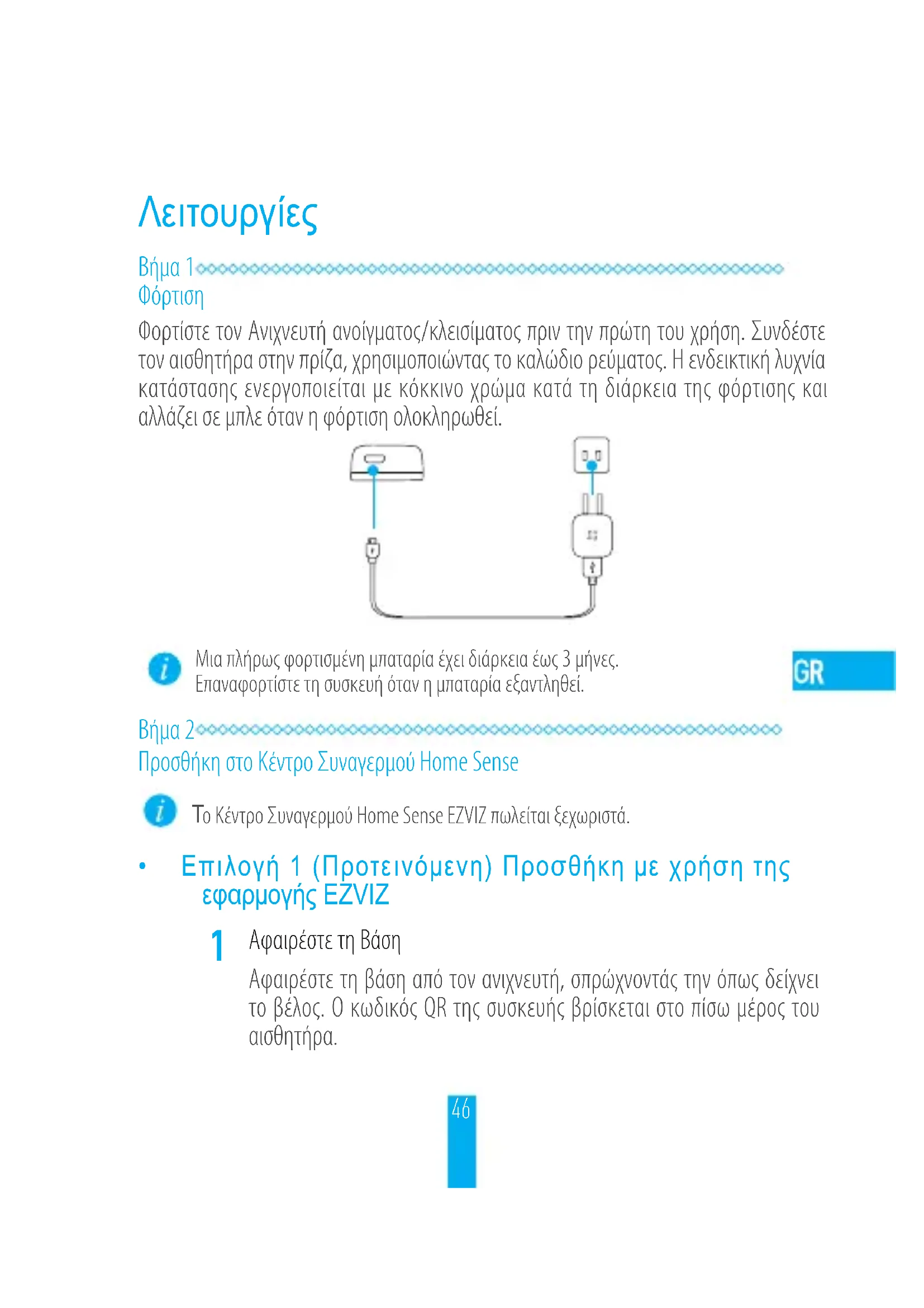 Φορτίστε τον Ανιχνευτή ανοίγματος/κλεισίματος πριν την πρώτη του χρήση. Συνδέστε τον αισθητήρα στην πρίζα, χρησιμοποιώντας το καλώδιο ρεύματος. Η ενδεικτική λυχνία κατάστασης ενεργοποιείται με κόκκινο χρώμα κατά τη διάρκεια της φόρτισης και αλλάζει σε μπλε όταν η φόρτιση ολοκληρωθεί. Μια πλήρως φορτισμένη μπαταρία έχει διάρκεια έως 3μήνες. Επαναφορτίστε τη συσκευή όταν η μπαταρία εξαντληθεί. Βήμα 2 Προσθήκη στο Κέντρο Συναγερμού Home Sense