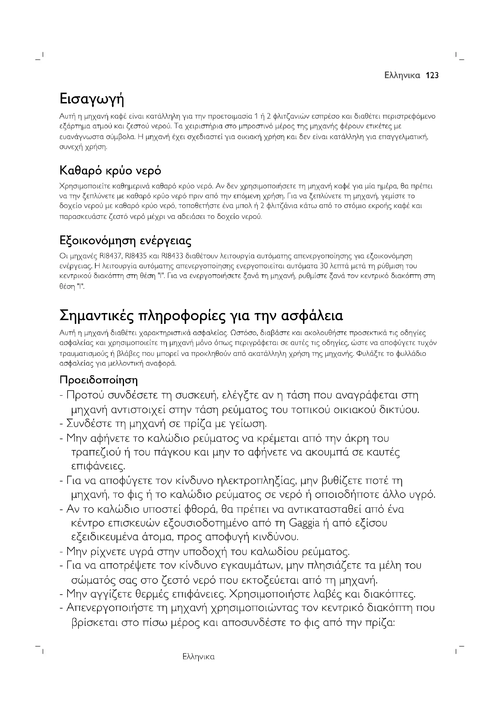 Αυτή η μηχανή καφέ είναι κατάλληλη για την προετοιμασία 1 ή 2 φλιτζανιών εσπρέσο και διαθέτει περιστρεφόμενοεξάρτημα ατμού και ζεστού νερού. Τα χειριστήρια στο μπροστινό μέρος της μηχανής φέρουν ετικέτες μεευανάγνωστα σύμβολα. Η μηχανή έχει σχεδιαστεί για οικιακή χρήση και δεν είναι κατάλληλη για επαγγελματική,συνεχή χρήση. Καθαρό κρύο νερό Χρησιμοποιείτε καθημερινά καθαρό κρύο νερό. Αν δεν χρησιμοποιήσετε τη μηχανή καφέ για μία ημέρα, θα πρέπεινα την ξεπλύνετε με καθαρό κρύο νερό πριν από την επόμενη χρήση. Για να ξεπλύνετε τη μηχανή, γεμίστε τοδοχείο νερού με καθαρό κρύο νερό, τοποθετήστε ένα μπολ ή 2 φλιτζάνια κάτω από το στόμιο εκροής καφέ καιπαρασκευάστε ζεστό νερό μέχρι να αδειάσει το δοχείο νερού. Εξοικονόμηση ενέργειας Οι μηχανές RI8437, RI8435 και RI8433 διαθέτουν λειτουργία αυτόματης απενεργοποίησης για εξοικονόμησηενέργειας. Η λειτουργία αυτόματης απενεργοποίησης ενεργοποιείται αυτόματα 30 λεπτά μετά τη ρύθμιση τουκεντρικού διακόπτη στη θέση "I". Για να ενεργοποιήσετε ξανά τη μηχανή, ρυθμίστε ξανά τον κεντρικό διακόπτη στηθέση "I". Σημαντικές πληροφορίες για την ασφάλεια Αυτή η μηχανή διαθέτει χαρακτηριστικά ασφαλείας. Ωστόσο, διαβάστε και ακολουθήστε προσεκτικά τις οδηγίεςασφαλείας και χρησιμοποιείτε τη μηχανή μόνο όπως περιγράφεται σε αυτές τις οδηγίες, ώστε να αποφύγετε τυχόντραυματισμούς ή βλάβες που μπορεί να προκληθούν από ακατάλληλη χρήση της μηχανής. Φυλάξτε το φυλλάδιοασφαλείας για μελλοντική αναφορά. Προειδοποίηση - Προτού συνδέσετε τη συσκευή, ελέγξτε αν η τάση που αναγράφεται στη μηχανή αντιστοιχεί στην τάση ρεύματος του τοπικού οικιακού δικτύου. - Συνδέστε τη μηχανή σε πρίζα με γείωση. - Μην αφήνετε το καλώδιο ρεύματος να κρέμεται από την άκρη του τραπεζιού ή του πάγκου και μην το αφήνετε να ακουμπά σε καυτές επιφάνειες. - Για να αποφύγετε τον κίνδυνο ηλεκτροπληξίας, μην βυθίζετε ποτέ τη μηχανή, το φις ή το καλώδιο ρεύματος σε νερό ή οποιοδήποτε άλλο υγρό. - Αν το καλώδιο υποστεί φθορά, θα πρέπει να αντικατασταθεί από ένα κέντρο επισκευών εξουσιοδοτημένο από τη Gaggia ή από εξίσου εξειδικευμένα άτομα, προς αποφυγή κινδύνου. - Μην ρίχνετε υγρά στην υποδοχή του καλωδίου ρεύματος. - Για να αποτρέψετε τον κίνδυνο εγκαυμάτων, μην πλησιάζετε τα μέλη του σώματός σας στο ζεστό νερό που εκτοξεύεται από τη μηχανή. - Μην αγγίζετε θερμές επιφάνειες. Χρησιμοποιήστε λαβές και διακόπτες. - Απενεργοποιήστε τη μηχανή χρησιμοποιώντας τον κεντρικό διακόπτη που βρίσκεται στο πίσω μέρος και αποσυνδέστε το φις από την πρίζα:
