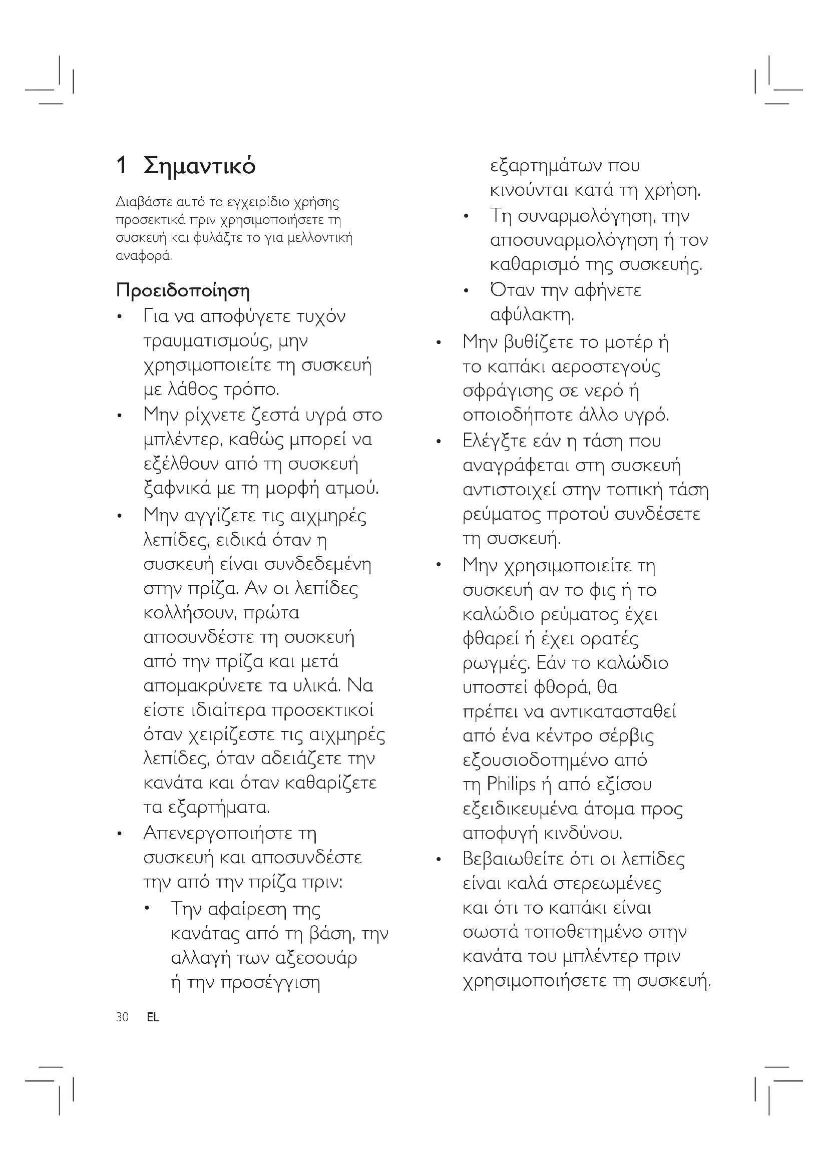 Μην χρησιμοποιείτε τη συσκευή αν το φις ή το καλώδιο ρεύματος έχει φθαρεί ή έχει ορατές ρωγμές. Εάν το καλώδιο υποστεί φθορά, θα πρέπει να αντικατασταθεί από ένα κέντρο σέρβις εξουσιοδοτημένο από τη Philips ή από εξίσου εξειδικευμένα άτομα προς αποφυγή κινδύνου.