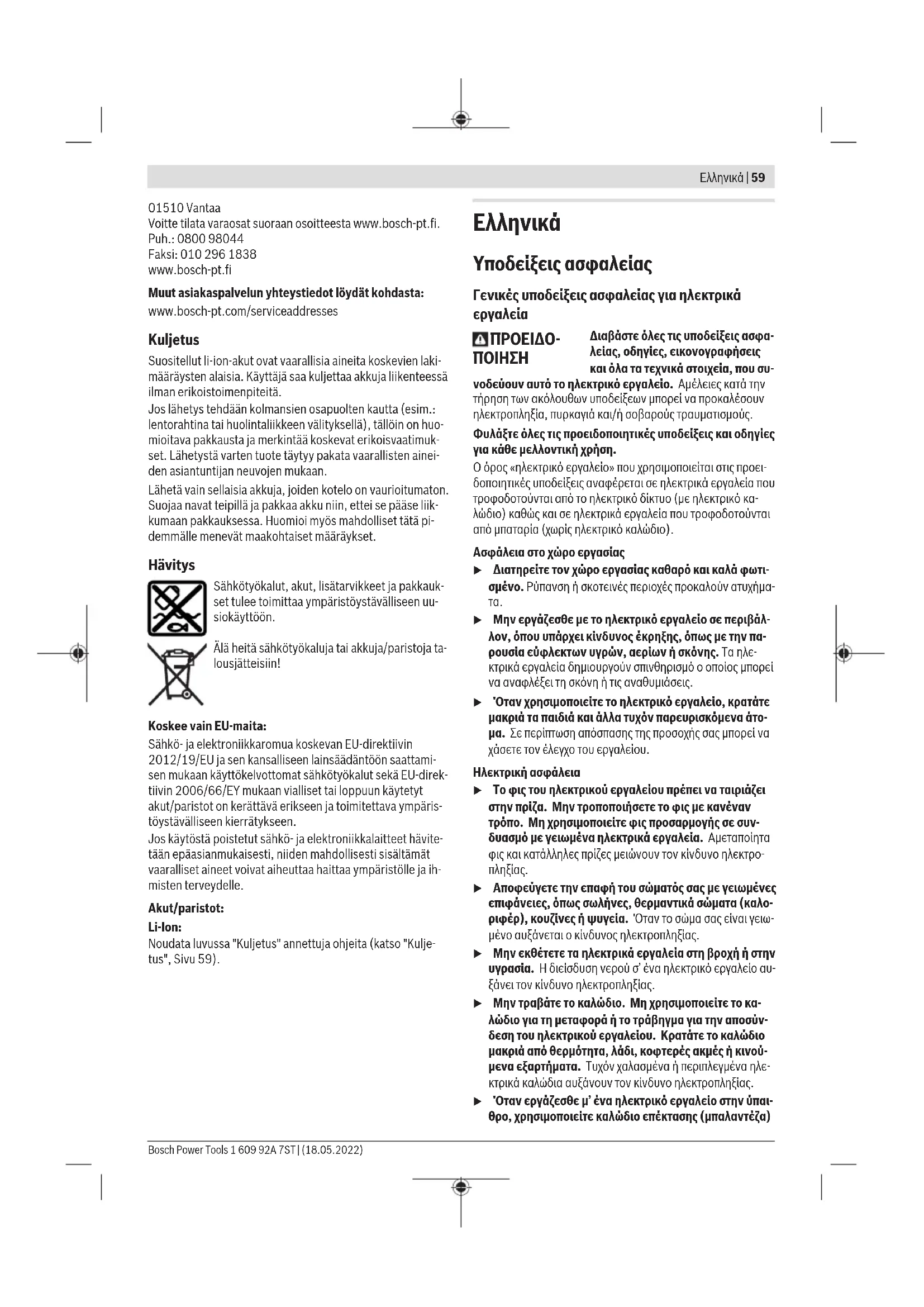 u Χρησιμοποιείτε τα ηλεκτρικά εργαλεία μόνο με τις ειδι- κά σχεδιασμένες μπαταρίες. Η χρήση άλλων μπαταριών μπορεί να οδηγήσει σε τραυματισμούς και να δημιουργήσει κίνδυνο πυρκαγιάς. 1 609 92A 7ST | (18.05.2022) Bosch Power ToolsΕλληνικά | 61 u Όταν η μπαταρία δε χρησιμοποιείται, κρατήστε την μα- κριά από άλλα μεταλλικά αντικείμενα, όπως συνδετή- ρες χαρτιών, νομίσματα, κλειδιά, καρφιά, βίδες ή άλλα μικρά μεταλλικά αντικείμενα που μπορούν να βραχυκυ- κλώσουν τις επαφές της μπαταρίας. Ένα βραχυκύκλωμα των επαφών της μπαταρίας μπορεί να προκαλέσει τραυματι- σμούς ή φωτιά. u Μια τυχόν εσφαλμένη χρήση μπορεί να οδηγήσει σε διαρροή υγρών από την μπαταρία. Αποφεύγετε κάθε επαφή μ’ αυτά. Σε περίπτωση τυχαίας επαφής ξεπλύνε- τε καλά με νερό. Εάν τα υγρά έρθουν σε επαφή με τα μάτια, ζητήστε επιπλέον ιατρική βοήθεια. Διαρρέοντα υγρά μπαταρίας μπορεί να οδηγήσουν σε ερεθισμούς του δέρματος ή σε εγκαύματα. u Μην χρησιμοποιείτε μπαταρία ή εργαλείο που είναι κα- τεστραμμένο ή τροποποιημένο. Οι χαλασμένες ή τροπο- ποιημένες μπαταρίες μπορεί να παρουσιάσουν μια απρόβλεπτη συμπεριφορά και να οδηγήσουν σε φωτιά, έκρηξη ή σε κίνδυνο τραυματισμού. u Μην εκθέτετε μια μπαταρία ή ένα εργαλείο μπαταρίας σε φωτιά ή σε πολύ υψηλές θερμοκρασίες. Η έκθεση στη φωτιά ή σε θερμοκρασία πάνω από τους 130 °C μπορεί να προκαλέσει έκρηξη. u Τηρείτε όλες τις υποδείξεις για τη φόρτιση και μη φορ- τίζετε την μπαταρία ή το εργαλείο μπαταρίας ποτέ εκτός της περιοχής θερμοκρασίας που αναφέρεται στις οδηγίες λειτουργίας. Η λάθος φόρτιση ή η φόρτιση εκτός της επιτρεπτής περιοχής θερμοκρασίας μπορεί να κατα- στρέψει την μπαταρία και να αυξήσει τον κίνδυνο πυρκα-