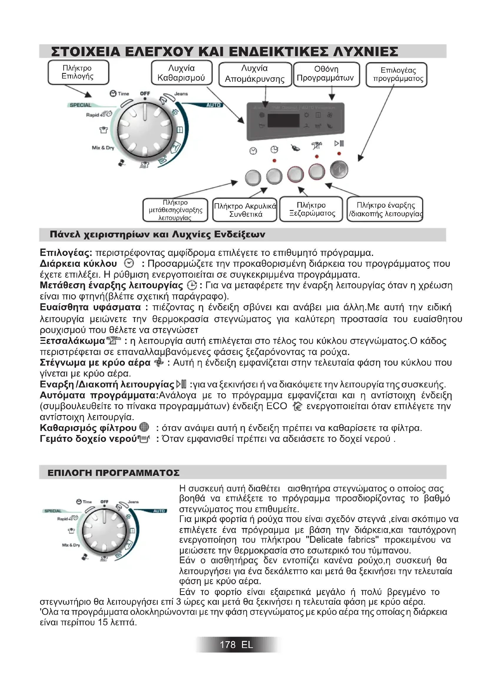 ρακόρ αποστράγγισης μ ε τ ο σ ω λ ή ν α αποχέτευσης νερού. 8.Συνδέστε τη συσκευή στο δίκτυο παροχής . Προσοχή : Εάν για να κ ά ν ε τ ε α υ τ ή τ η ν προσθήκη μετακινήσατε τη συσκευή πρέπει να α φ ή σ ε τ ε ε κ τ ό ς λειτουργίας τουλάχιστον 4 ώ ρ ε ς , ώ σ τ ε τ ο λιπαντικό να επανακυκλοφορήσει στο κομπρεσσέρ. Η μη εφαρμογή αυτής της οδηγίας μπορεί να κ α τ α σ τ ρ έ ψ ε ι τ ο κ ο μ π ρ ε σ σ έ ρ τ η ς συσκευής.ΣΤΟΙΧΕΙΑ ΕΛΕΓΧΟΥ ΚΑΙ ΕΝΔΕΙΚΤΙΚΕΣ ΛΥΧΝΙΕΣ Η συσκευή αυτή διαθέτει αισθητήρα στεγνώματος ο οποίος σας βοηθά να επιλέξετε το πρόγραμμα προσδιορίζοντας το βαθμό στεγνώματος που επιθυμείτε. Για μικρά φορτία ή ρούχα που είναι σχεδόν στεγνά ,είναι σκόπιμο να επιλέγετε ένα πρόγραμμα με βάση την διάρκεια,και ταυτόχρονη ενεργοποίηση του πλήκτρου ''Delicate fabrics'' προκειμένου να μειώσετε την θερμοκρασία στο εσωτερικό του τύμπανου. Εάν ο αισθητήρας δεν εντοπίζει κανένα ρούχο,η συσκευή θα λειτουργήσει για ένα δεκάλεπτο και μετά θα ξεκινήσει την τελευταία φάση με κρύο αέρα. Εάν το φορτίο είναι εξαιρετικά μεγάλο ή πολύ βρεγμένο το στεγνωτήριο θα λειτουργήσει επί 3 ώρες και μετά θα ξεκινήσει η τελευταία φάση με κρύο αέρα. 'Ολα τα προγράμματα ολοκληρώνονται με την φάση στεγνώματος με κρύο αέρα της οποίας η διάρκεια είναι περίπου 15 λεπτά. ΕΠΙΛΟΓΗ ΠΡΟΓΡΑΜΜΑΤΟΣ Πάνελ χειριστηρίων και Λυχνίες Ενδείξεων 178 EL Eπιλογέας: περιστρέφοντας αμφίδρομα επιλέγετε το επιθυμητό πρόγραμμα. Διάρκεια κύκλου : Προσαρμώζετε την προκαθορισμένη διάρκεια του προγράμματος που έχετε επιλέξει. Η ρύθμιση ενεργοποιείται σε συγκεκριμμένα προγράμματα. Μετάθεση έναρξης λειτουργίας : Για να μεταφέρετε την έναρξη λειτουργίας όταν η χρέωση είναι πιο φτηνή(βλέπε σχετική παράγραφο). Ευαίσθητα υφάσματα : πιέζοντας η ένδειξη σβύνει και ανάβει μια άλλη.Με αυτή την ειδική λειτουργία μειώνετε την θερμοκρασία στεγνώματος για καλύτερη προστασία του ευαίσθητου ρουχισμού που θέλετε να στεγνώσετ Ξετσαλάκωμα : η λειτουργία αυτή επιλέγεται στο τέλος του κύκλου στεγνώματος.Ο κάδος περιστρέφεται σε επαναλλαμβανόμενες φάσεις ξεζαρόνοντας τα ρούχα. Στέγνωμα με κρύο αέρα : Αυτή η ένδειξη εμφανίζεται στην τελευταία φάση του κύκλου που γίνεται με κρύο αέρα. Εναρξη /Διακοπή λειτουργίας :για να ξεκινήσει ή να διακόψετε την λειτουργία της συσκευής. Αυτόματα προγράμματα:Ανάλογα με το πρόγραμμα εμφανίζεται και η αντίστοιχη ένδειξη (συμβουλευθείτε το πίνακα προγραμμάτων) ένδειξη ECO ενεργοποιείται όταν επιλέγετε την αντίστοιχη λειτουργία. Καθαρισμός φίλτρου : όταν ανάψει αυτή η ένδειξη πρέπει να καθαρίσετε τα φίλτρα. Γεμάτο δοχείο νερού : Όταν εμφανισθεί πρέπει να αδειάσετε το δοχεί νερού . Πλήκτρο Ακρυλικά ΣυνθετικάΠλήκτρο μετάθεσηςέναρξης λειτουργίας